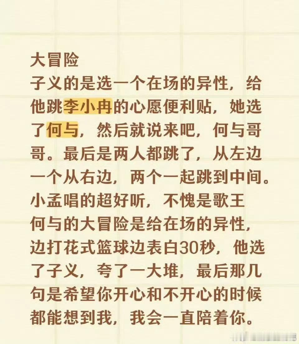 孟子义清唱心愿便利贴孟子义大冒险清唱心愿便利贴 网友写了孟子义何以的好六repo,孟姐选了大冒险,对着何与清唱心愿便利贴