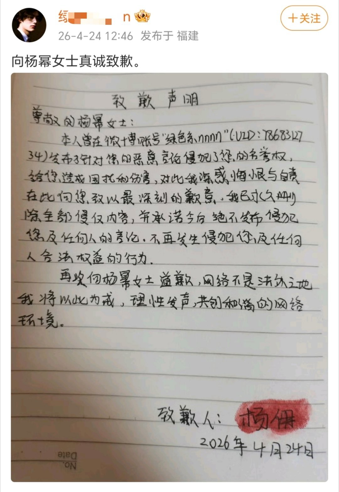 杨幂告黑成功,黑粉向幂姐手写道歉信并赔偿。互联网非法外之地,支持幂姐维权!👊?