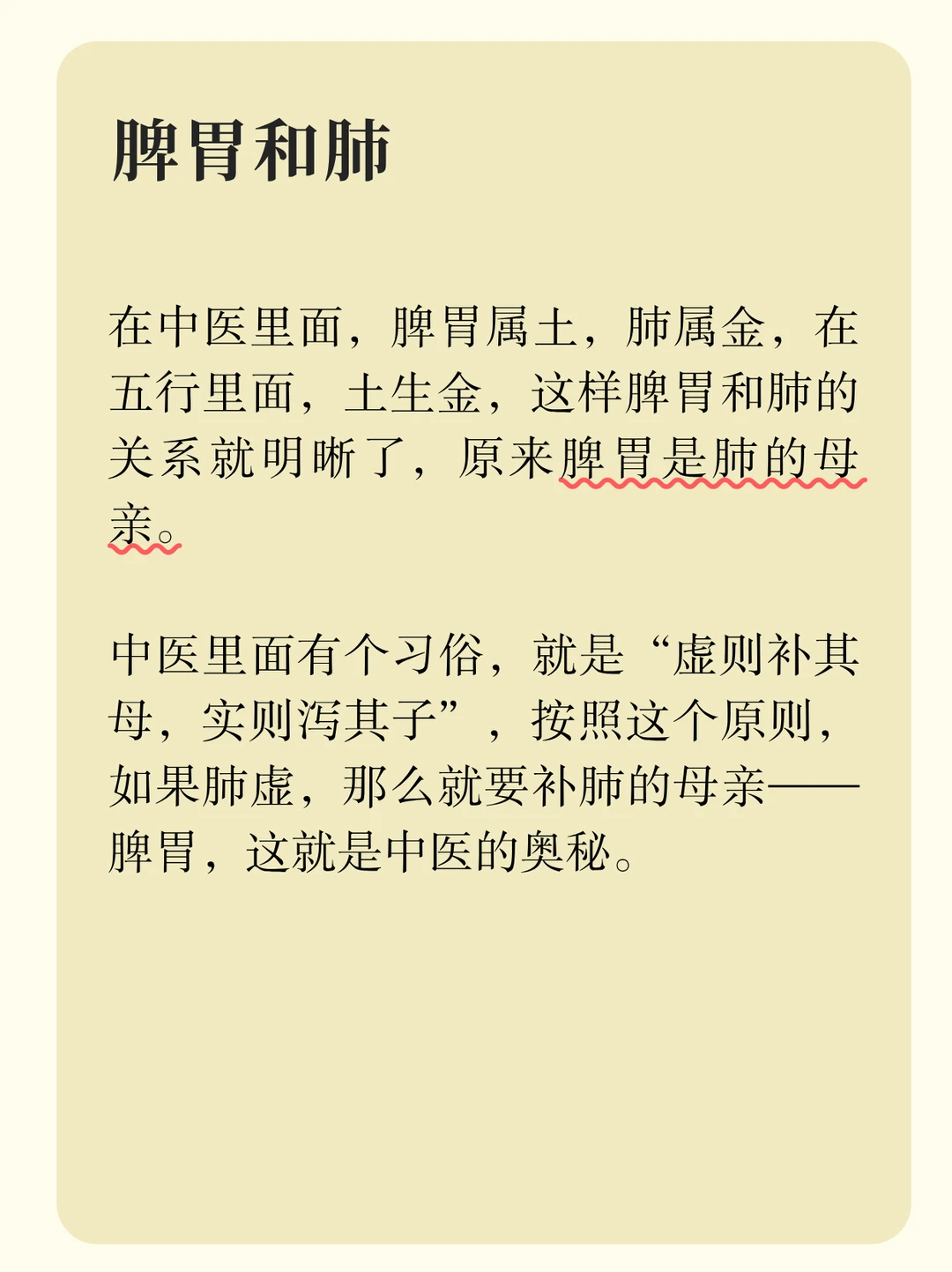 在中医里面,脾胃属土,肺属金,在五行里面,土生金,这样脾胃和肺的关系就明晰了,原来脾胃是肺的母亲。中医里面有个习俗,就是“虚则补其母,实则泻其子”,按照这个原则,如果肺虚,那么就要补肺的母亲——脾胃,这就是中医的奥秘。很多人问,如果直接补肺不就可以了吗?为什么要绕个弯子,先补脾胃呢?