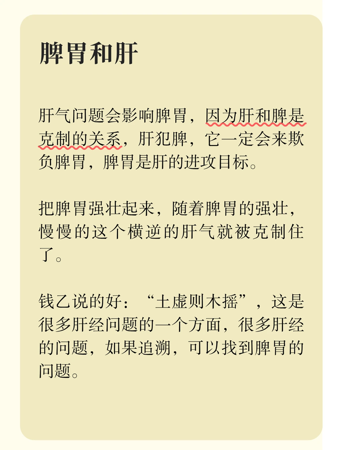 肝气问题会影响脾胃,因为肝和脾是克制的关系,肝犯脾,它一定会来欺负脾胃,脾胃是肝的进攻目标。把脾胃强壮起来,随着脾胃的强壮,慢慢的这个横逆的肝气就被克制住了。钱乙说的好:“土虚则木摇”,这是很多肝经问题的一个方面,很多肝经的问题,如果追溯,可以找到脾胃的问题。