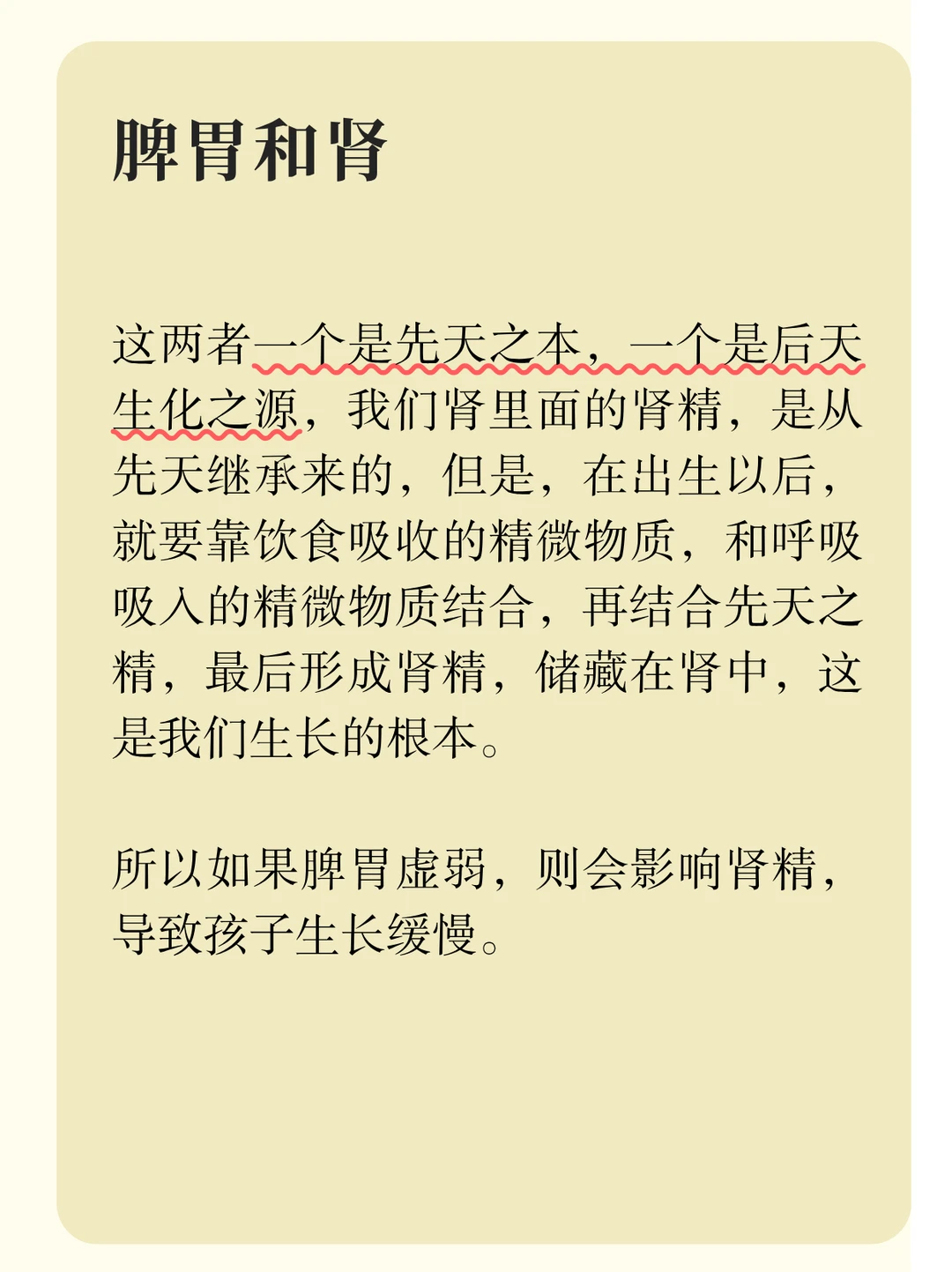 这两者一个是先天之本,一个是后天生化之源,我们肾里面的肾精,是从先天继承来的,但是,在出生以后,就要靠饮食吸收的精微物质,和呼吸吸入的精微物质结合,再结合先天之精,最后形成肾精,储藏在肾中,这是我们生长的根本,所以如果脾胃虚弱,则会影响肾精,导致孩子生长缓慢[拳头R]。