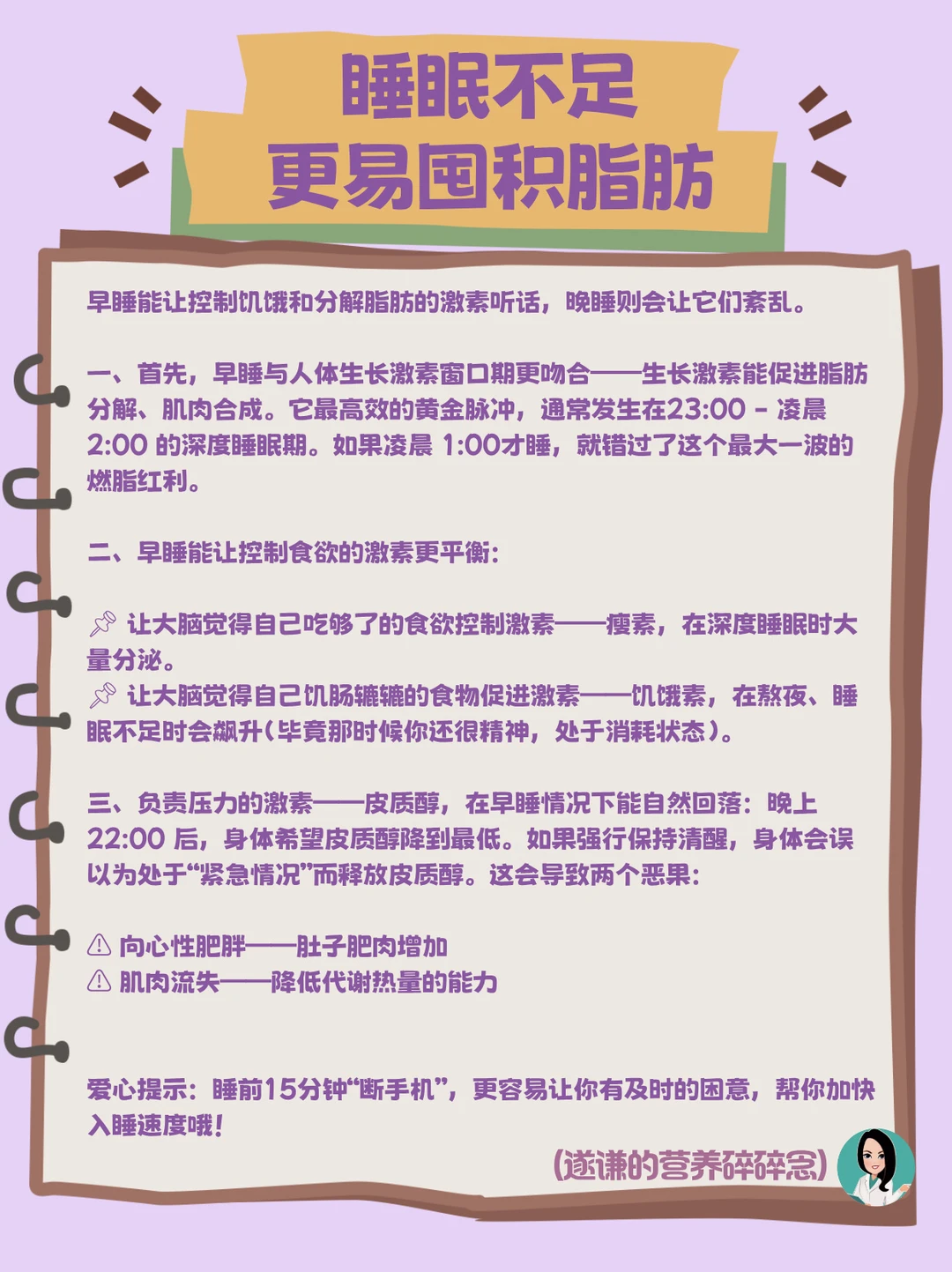 因为:💤 早睡能让控制饥饿和分解脂肪的激素听话,晚睡则会让它们紊乱。
