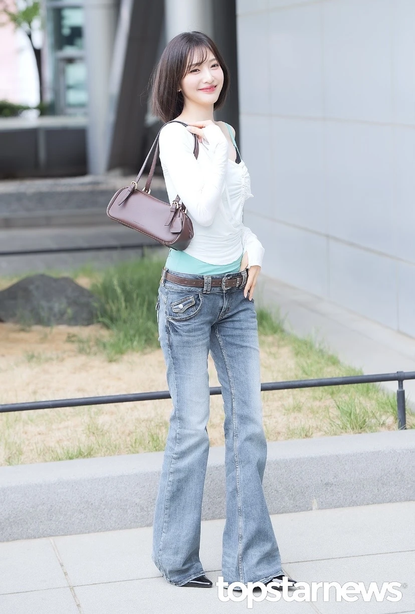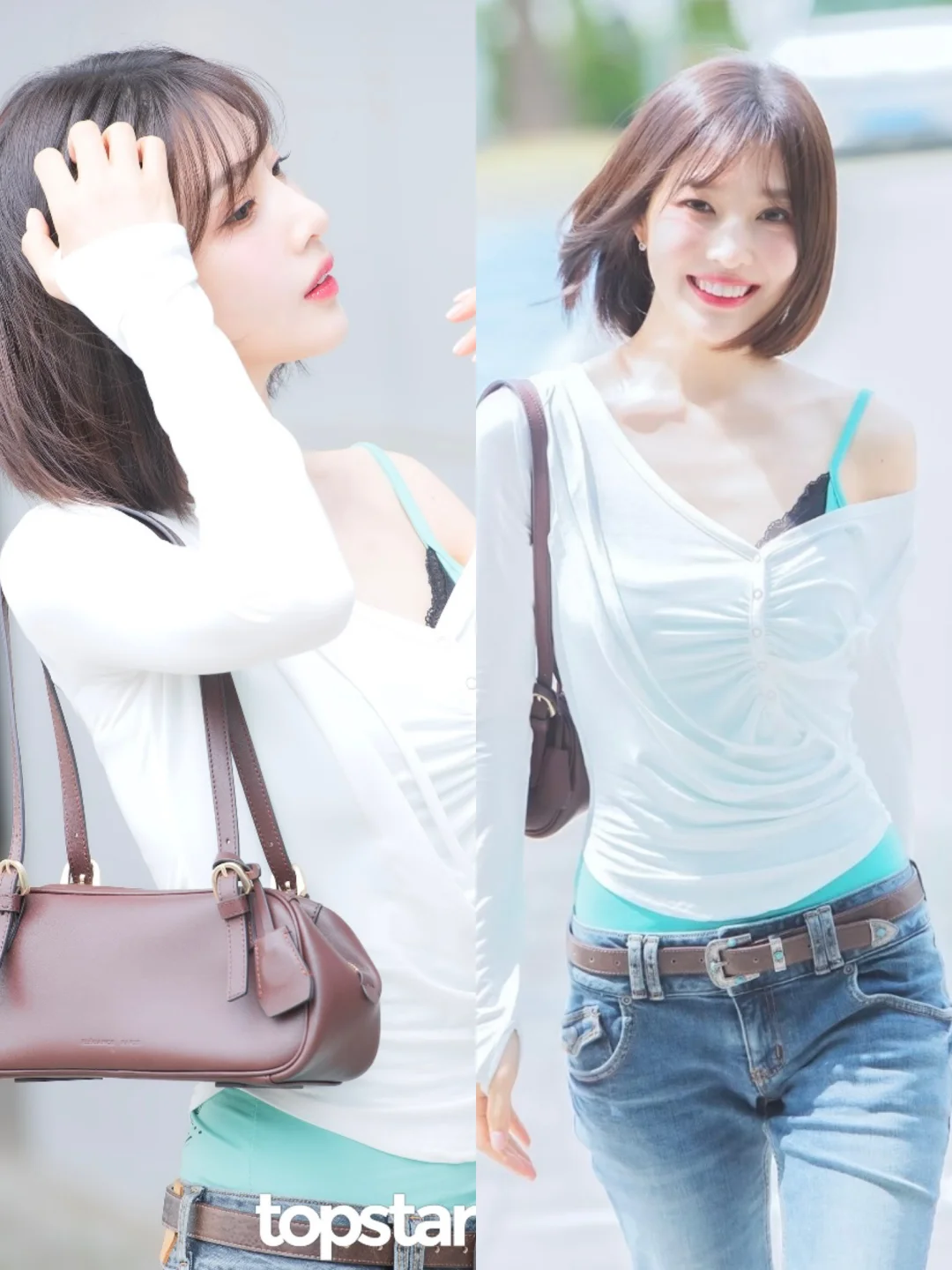 修身白罩衫+薄荷绿内搭的叠穿,自带美式复古的俏皮感,低腰微喇牛仔裤+金属扣腰带,把Y2K辣妹的腰臀比修饰得绝绝子!