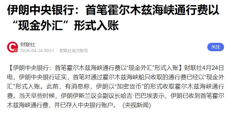 当地时间4月23日,伊朗伊斯兰议会副议长哈吉·巴巴埃对外正式确认,首笔霍尔木兹海峡通行费收入已全额汇入伊朗中央银行账户。