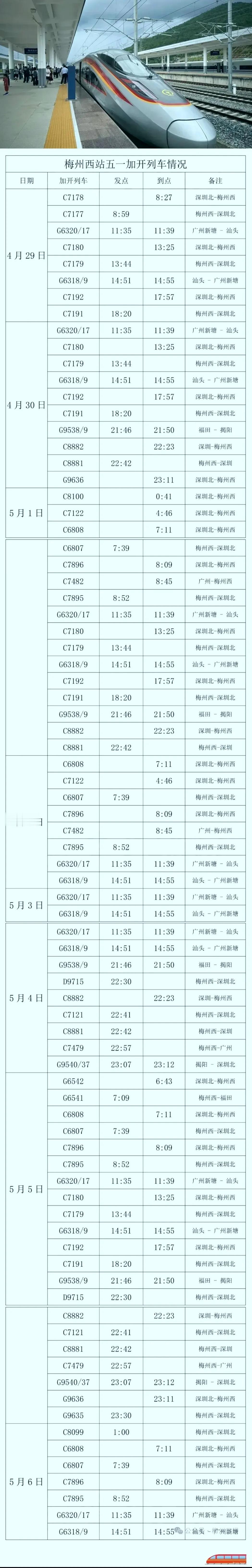 从梅州西站高铁站了解到,五一小长假即将来临。为全力满足广大旅客假日出行需求,应对假期客流高峰,梅州西站决定在4月29日至5月6日“五一”假期铁路运输期间,累计增开列车81趟,其中专门增开4趟夜间高铁,具体增开车次如下图: