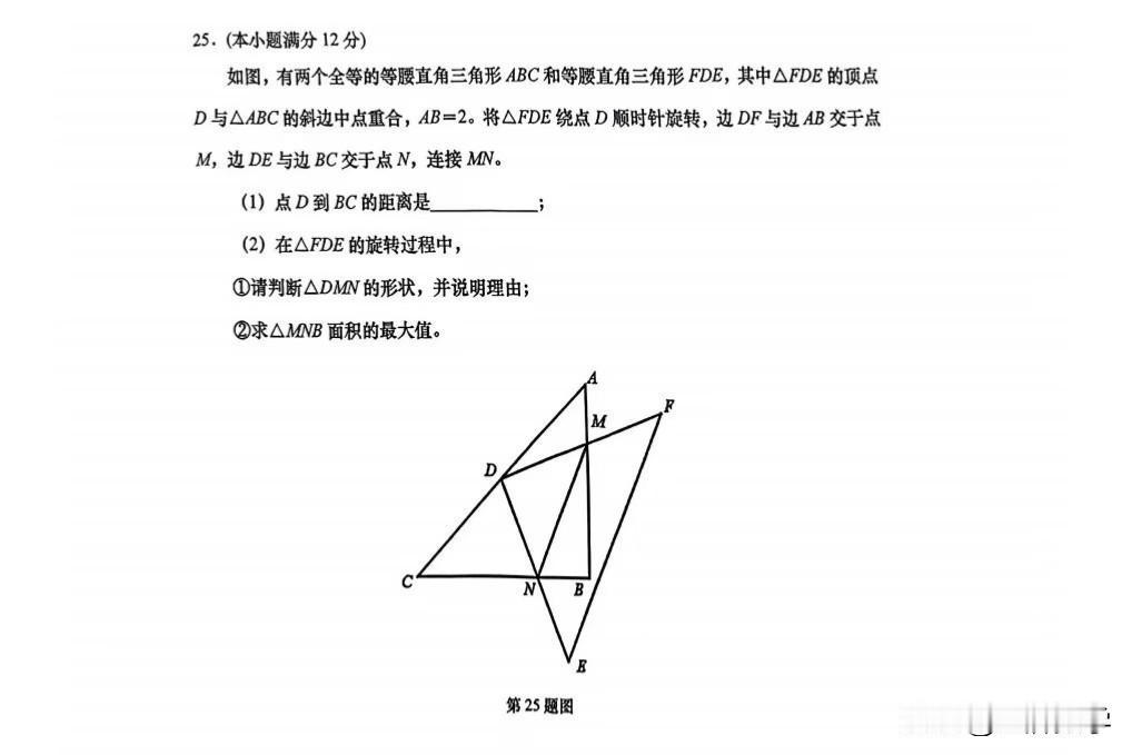 第25题,因为七年级刚开始接触全等,还考不到复杂的几何模型,所以,这就是一个比较典型的对角互补模型,第一小问,得到BC的距离相当于AB的一半,等于1。第二小问,M、D、N是等腰直角三角形,所采用的思路就是连接BD,BD是角ABC的平分线,过点D分别往BA、BC做双垂线,垂足为H、K,证一下三角形 dhm 全等于三角形 dkn.这个结论就得出来了。