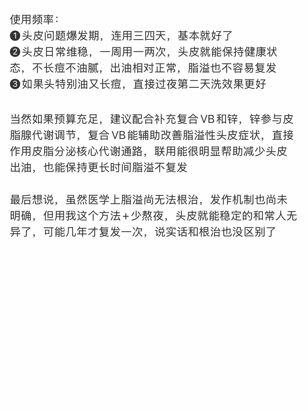 当然如果预算充足,建议配合补充复合VB和锌,锌参与皮脂腺代谢调节,复合VB辅助改善脂溢性头皮症状,联用能很明显减少头皮出油,也能保持更长时间脂溢不复发