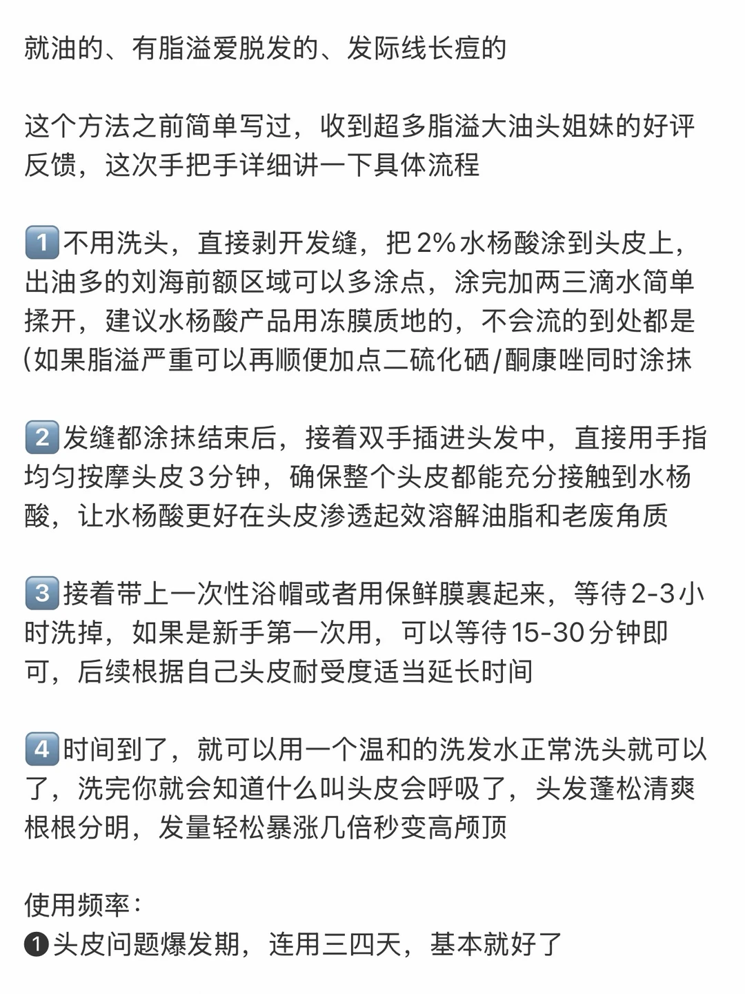 1️⃣不用洗头,直接剥开发缝,把2%水杨酸涂到头皮上,出油多的刘海前额区域可以多涂点,涂完加两三滴水简单揉开,建议水杨酸产品用冻膜质地的,不会流的到处都是(如果脂溢严重可以再顺便加点二硫化硒/酮康唑同时涂抹