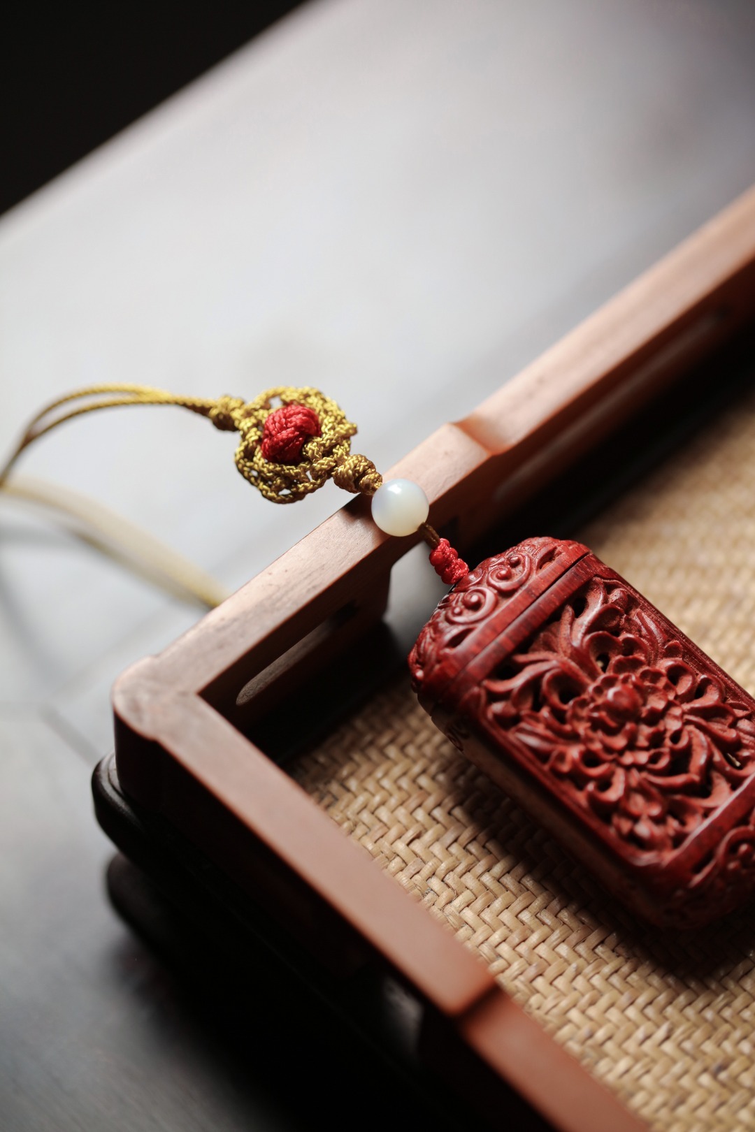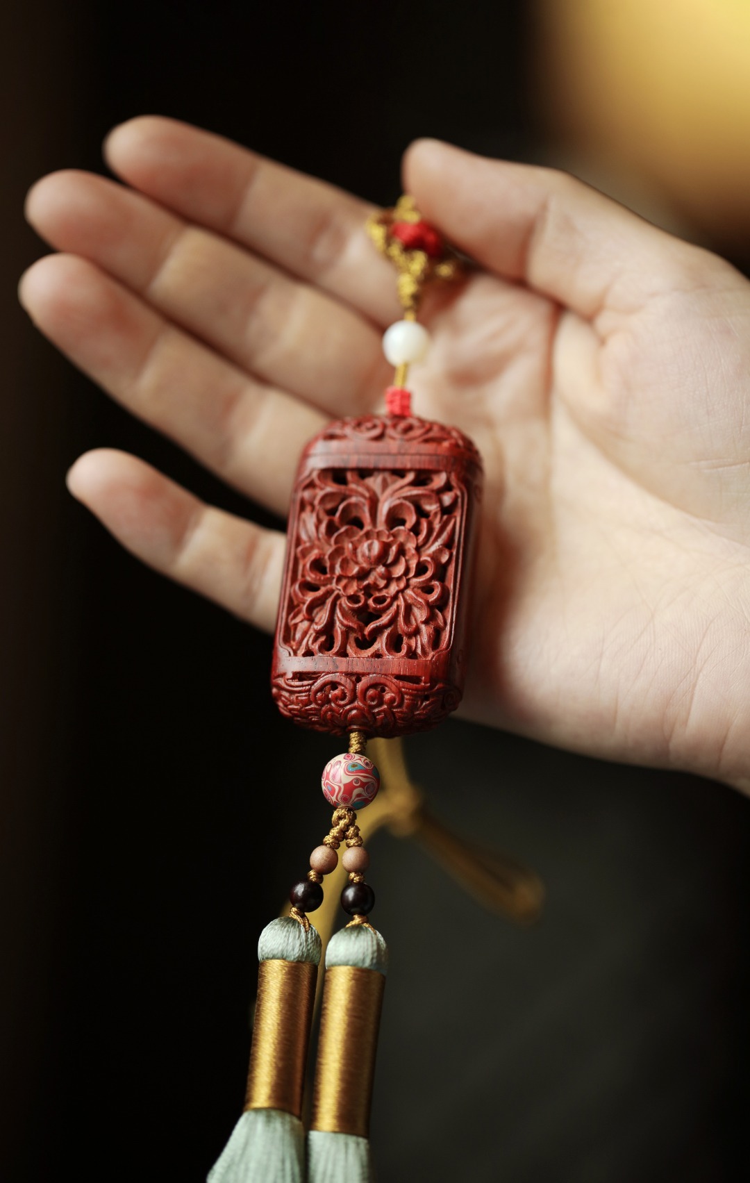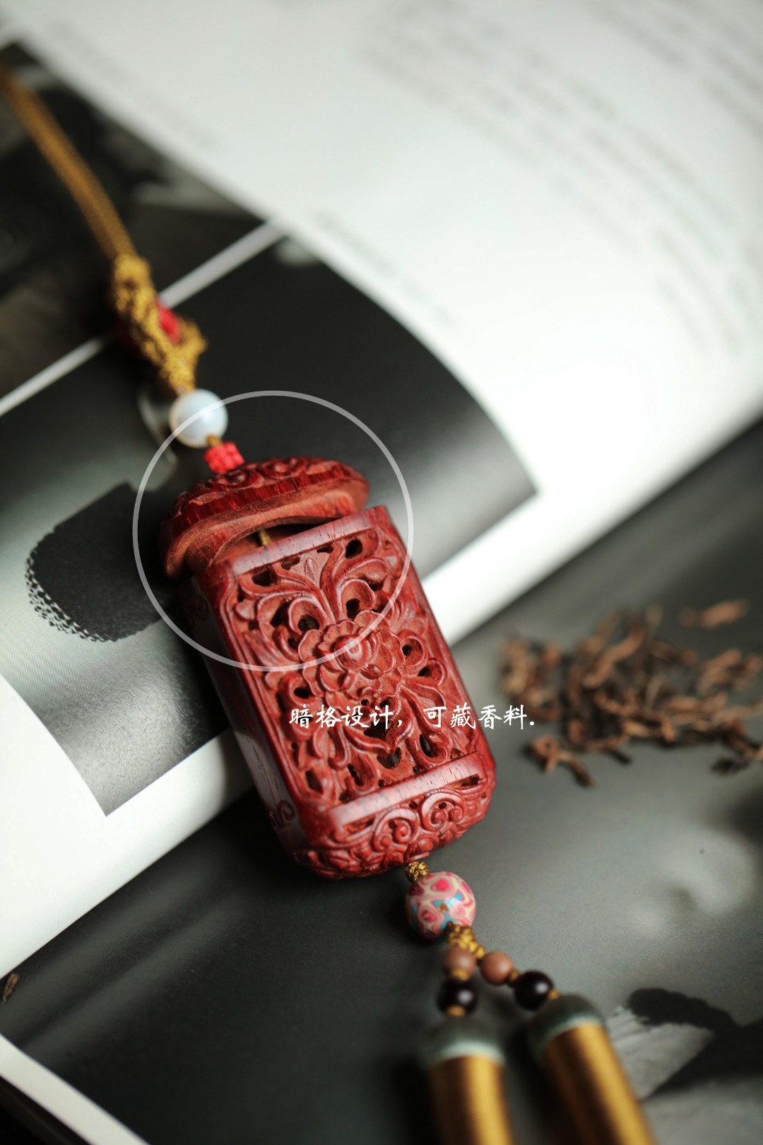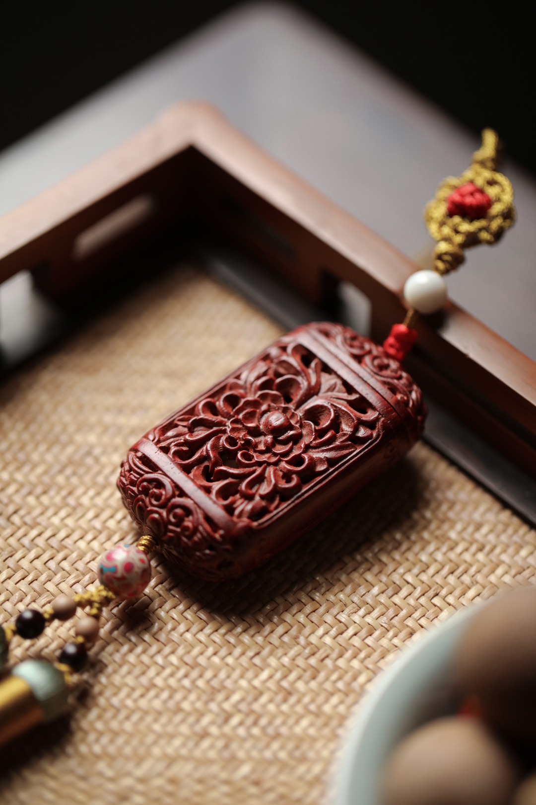 小叶紫檀 | 宝相花·香囊 挂件料质润泽,双面镂空雕莲花纹;整体素雅不失精致,贵
