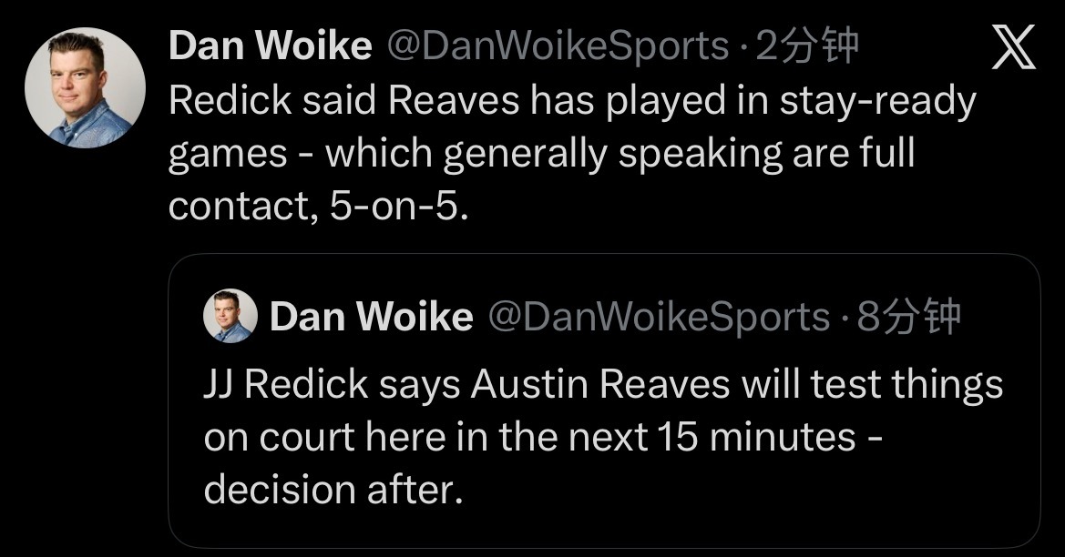 雷迪克表示,里夫斯会在接下来15分钟内上场进行测试,之后再决定是否出战! “里夫