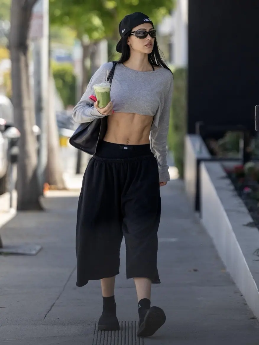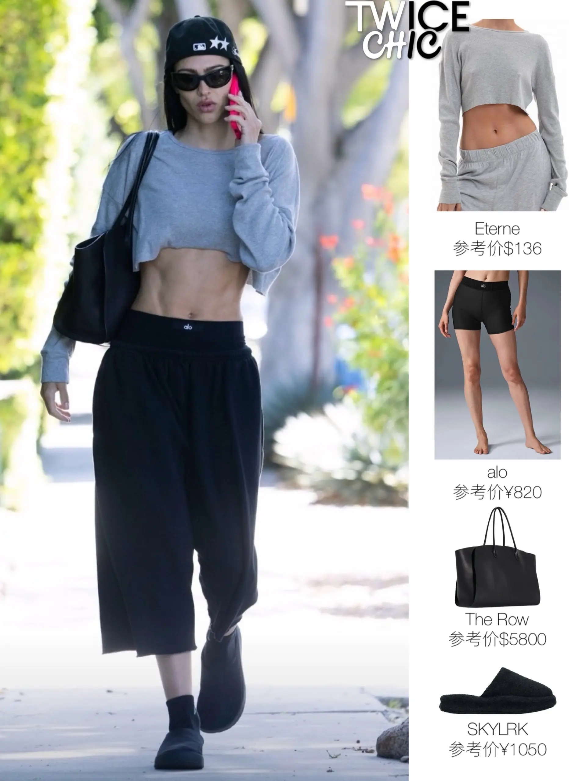 一件灰色短上衣配宽松百慕大短裤,用The Row黑色手袋完成运动造型。当然整组街拍里最抢镜的莫过于她的腹肌,每刷到一次都要感叹好有力量美!
