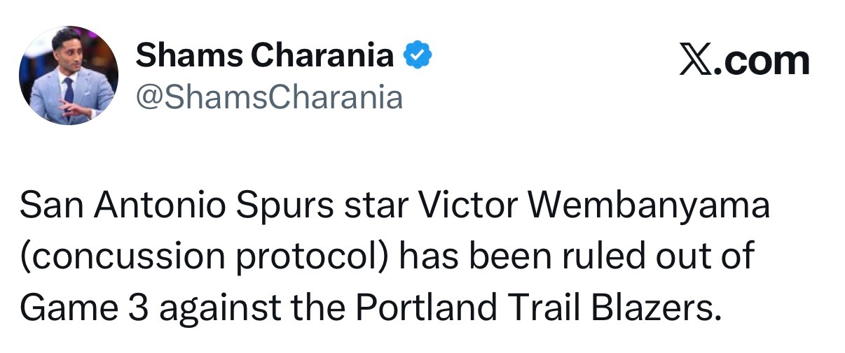 Shams:文班亚马(触发脑震荡保护协议)将缺席对阵波特兰开拓者队的第三场比赛。