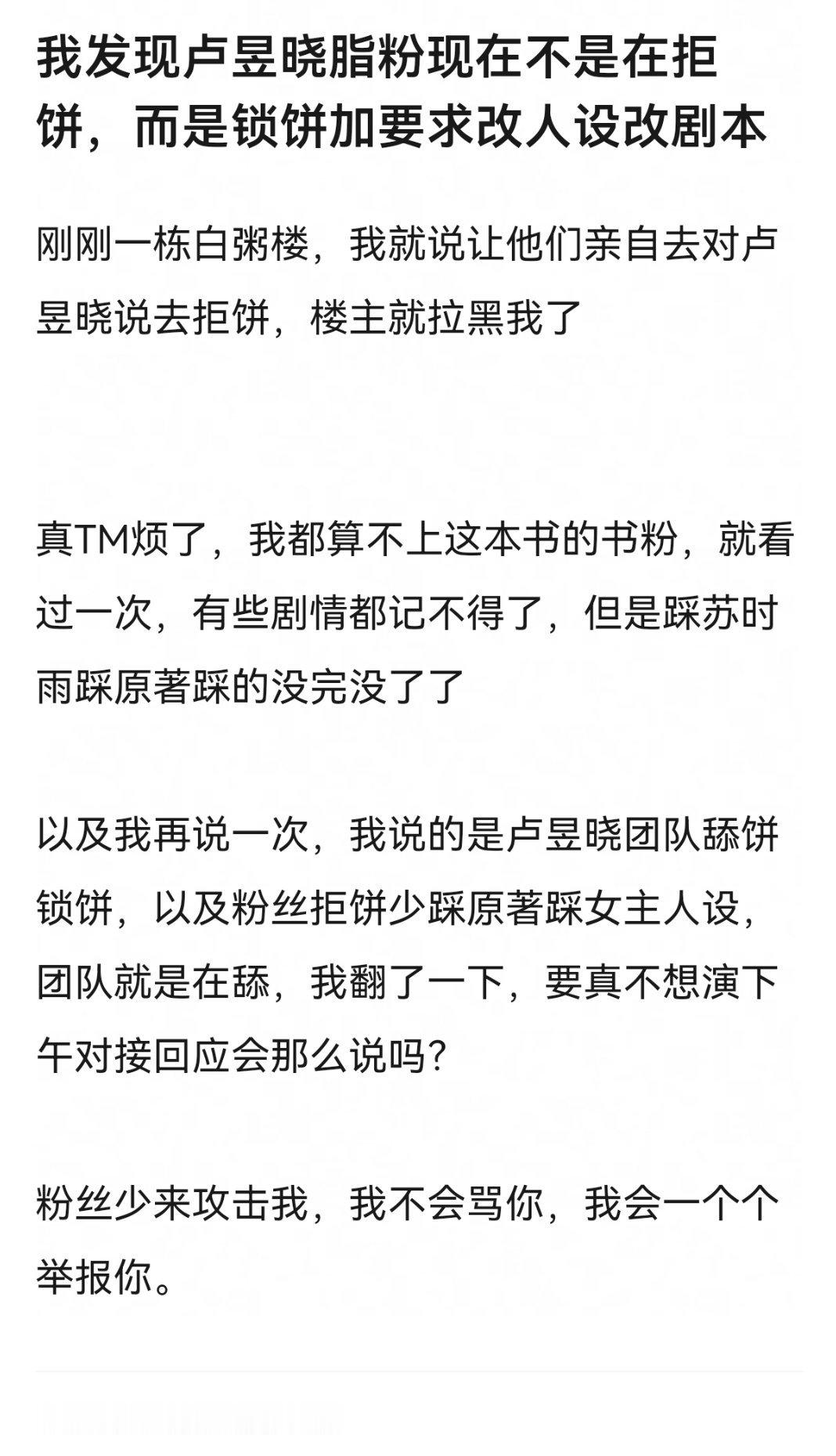 我发现卢昱晓脂粉现在不是在拒饼,而是锁饼加要求改人设改剧本。