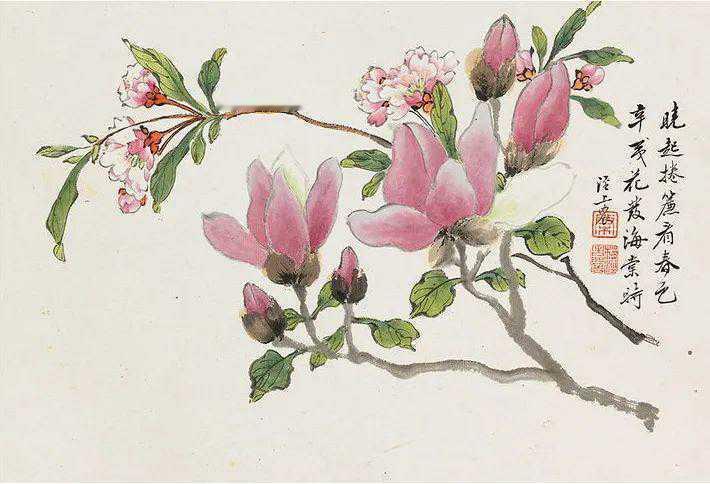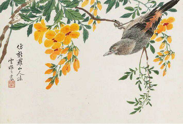 董棨《花鸟册》,八开,设色纸本,22×32cm,绘月季、凌霄、芙蓉、腊梅、荷花、辛夷、海棠等花卉,其中四开配以八哥、绶带、翠鸟等飞禽,兼工带写,设色明丽,用笔轻快,栩栩如生。