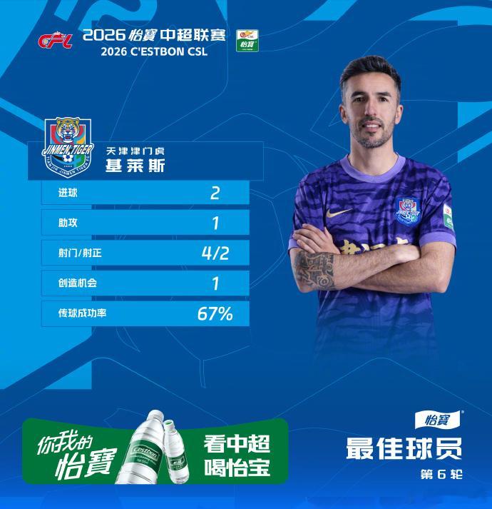 恭喜基莱斯成为中超第六轮官方最佳球员。荣幸的为基莱斯颁奖,感谢咪咕的老师们。基莱斯当选中超第6轮最佳球员一起登场