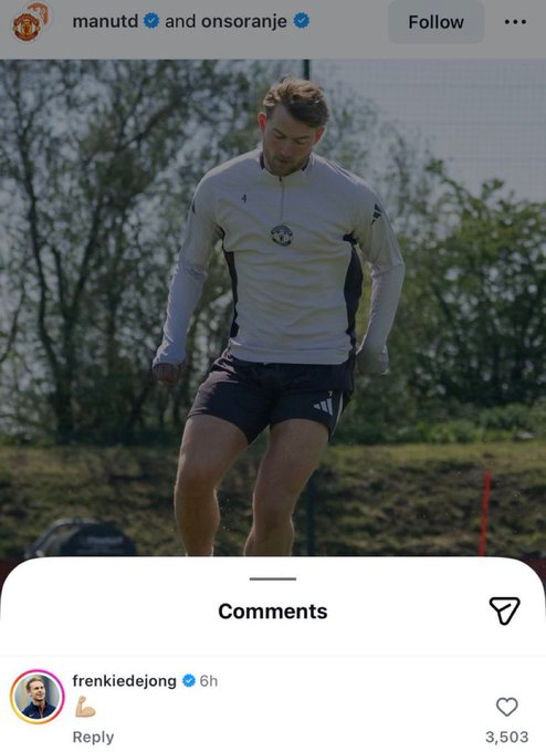 曼联官方ins发布了德利赫特场地训练的图片德容留言:💪