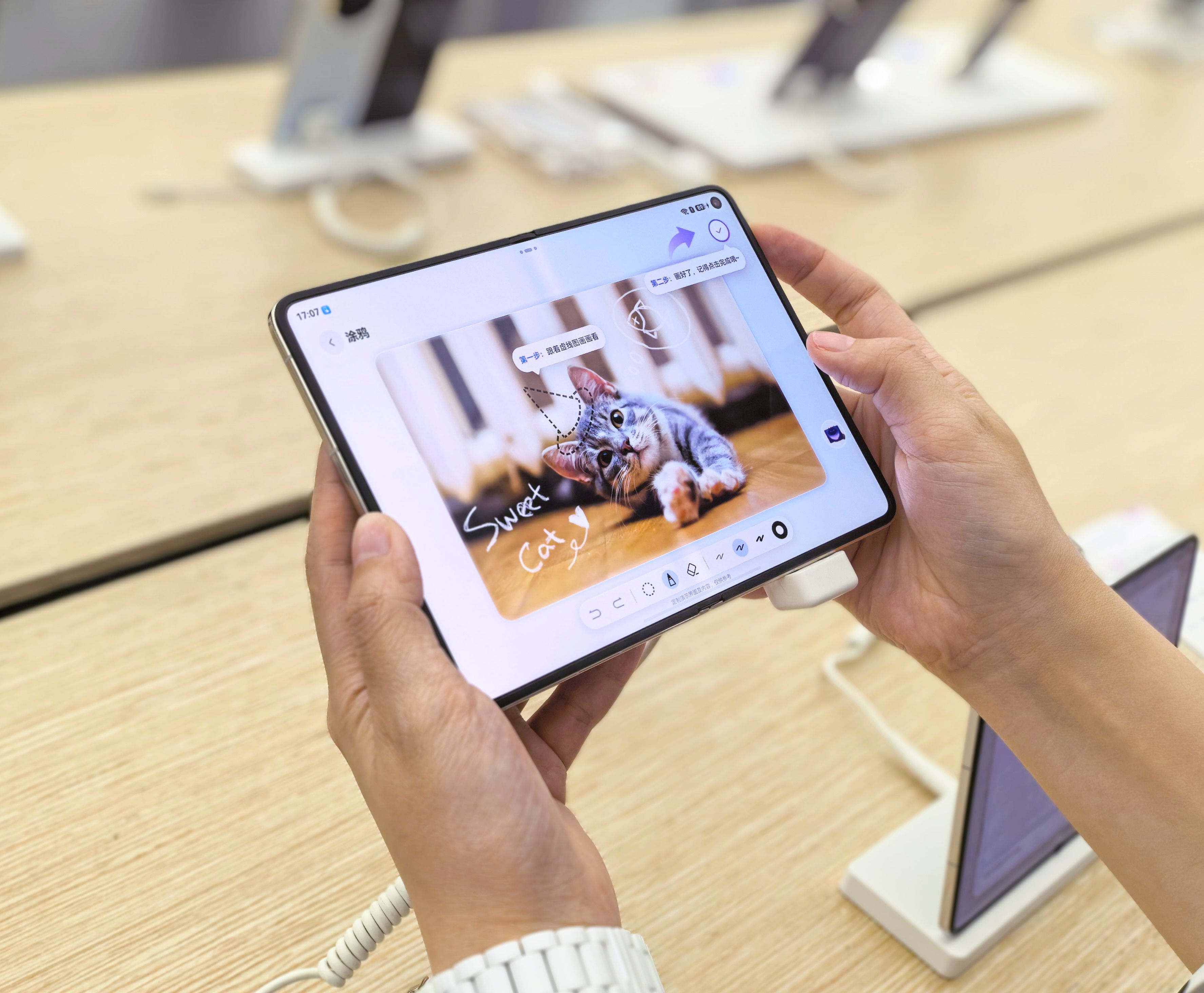 【#华为大阔折再现抢购热潮#】华为Pura X Max于今日上午10:08正式开售,新品一经发布便引发大量关注,今日开售后大量消费者前往线下门店体验,氛围火爆。不少消费者在体验后表示,这款产品不仅在设计上打破了传统折叠屏形态,展开后的比例还非常适合看书与看电影,视觉体验很沉浸,现场好评不断。