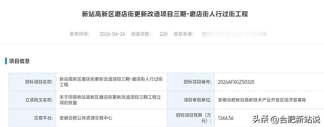 就在4月24日,合肥公共资源交易平台正式公示了,新站区磨店街更新改造项目三期——人行过街工程。招标信息,项目预算高达1344.56万元,一座横跨东方大道的人行天桥,终于要来了!