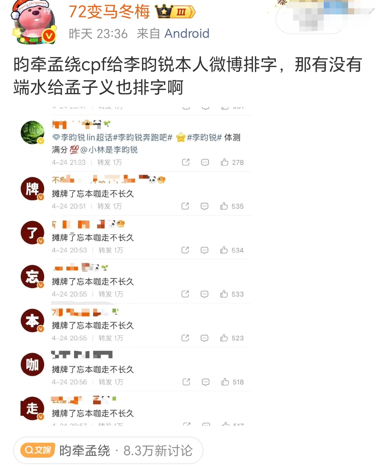 昀牵孟绕cpf贴脸开大直接在李昀锐微博热转排字,随后李昀锐粉丝也在热转排字超过去