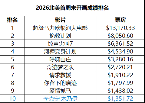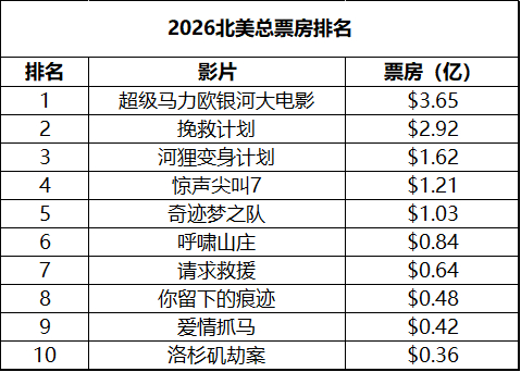 2026年第16周北美票房 :1.《超级马力欧银河大电影》三连冠,全球票房突破7.76亿美元;2.《挽救计划》全球票房突破5.8亿美元;3.《李克宁 木乃伊》在新片中表现最佳。(数据:boxofficemojo)