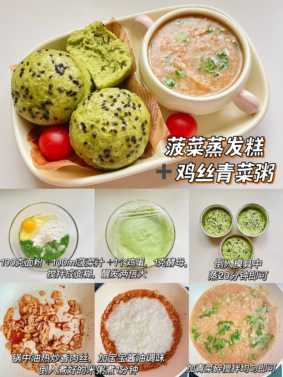 🥣菠菜蒸发糕➕鸡丝青菜粥