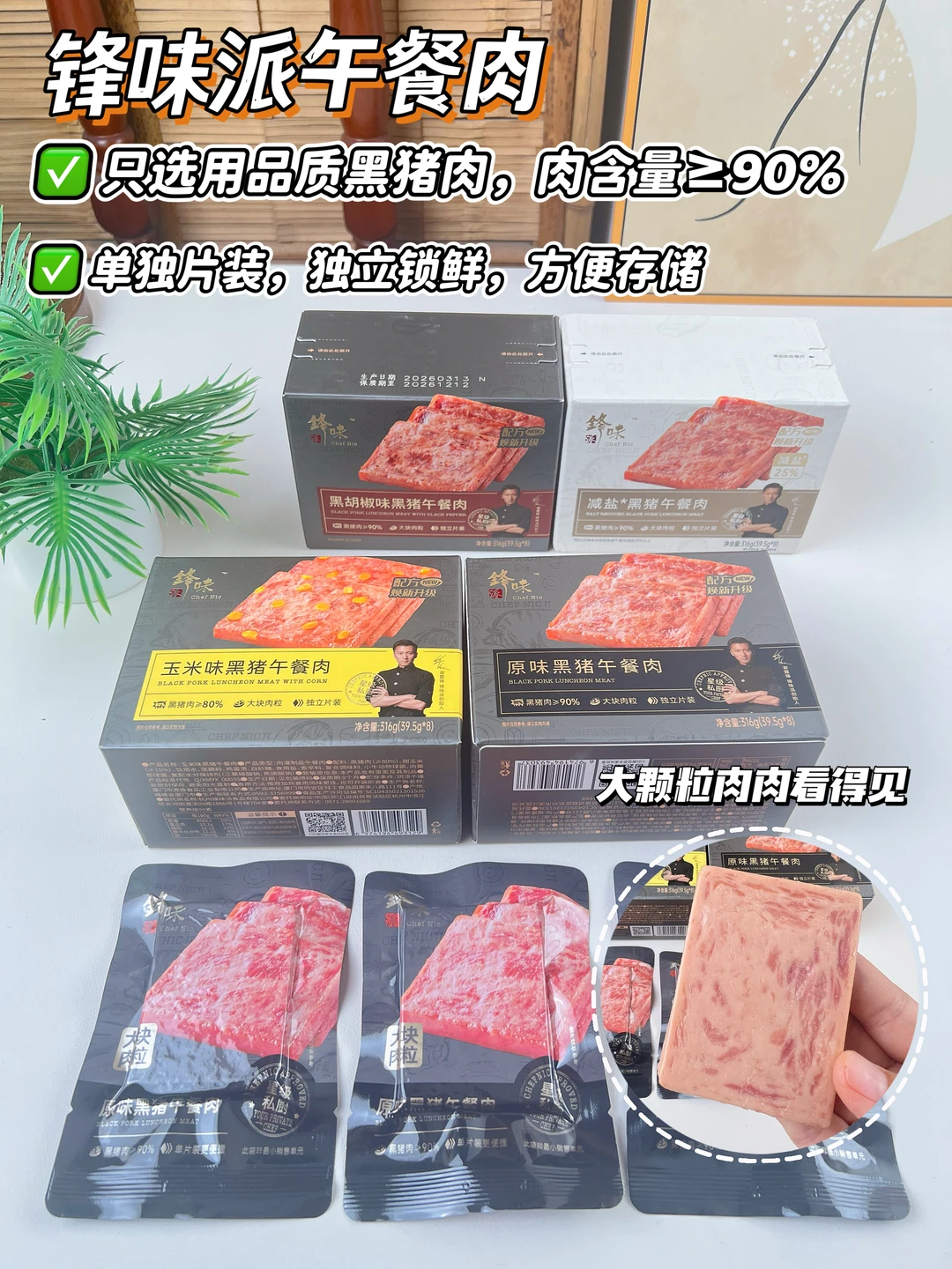 锋味派午餐肉,真是是早餐必备!它是独立包装方便储存,孩子非常爱吃原味的!里边黑猪肉含量≥90%,放心好肉,吃的太安心了,平时煎着当早餐吃,孩子都可喜欢了!