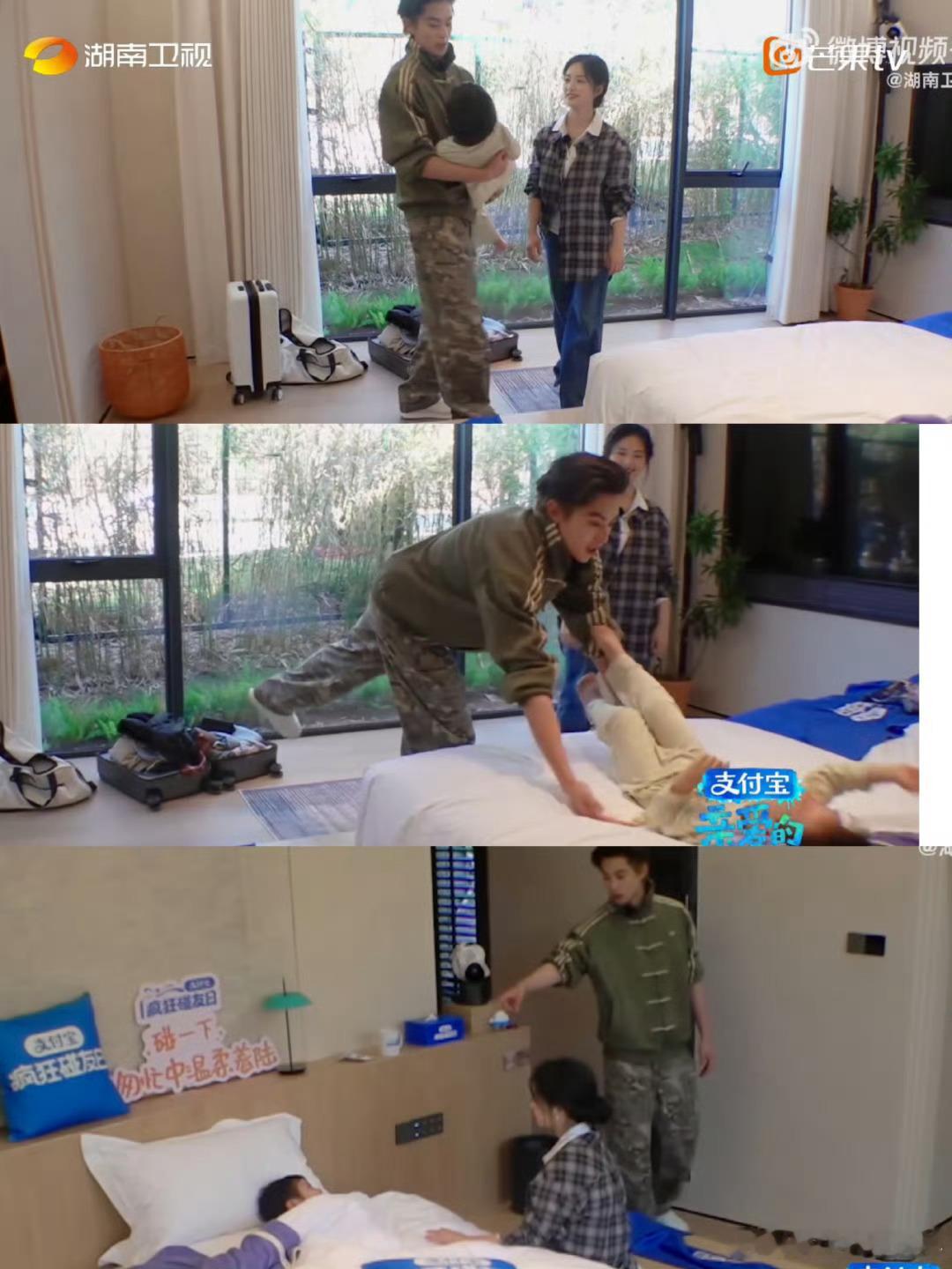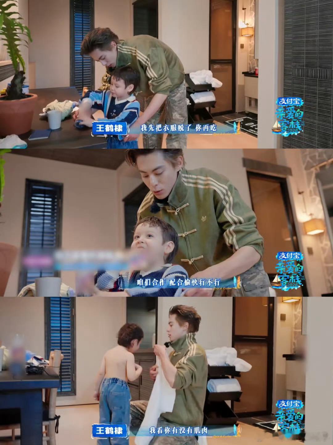 好像看到了王鹤棣当爸爸的样子客栈里王鹤棣花式哄娃,陪轩轩换睡衣玩小游戏,动作温柔