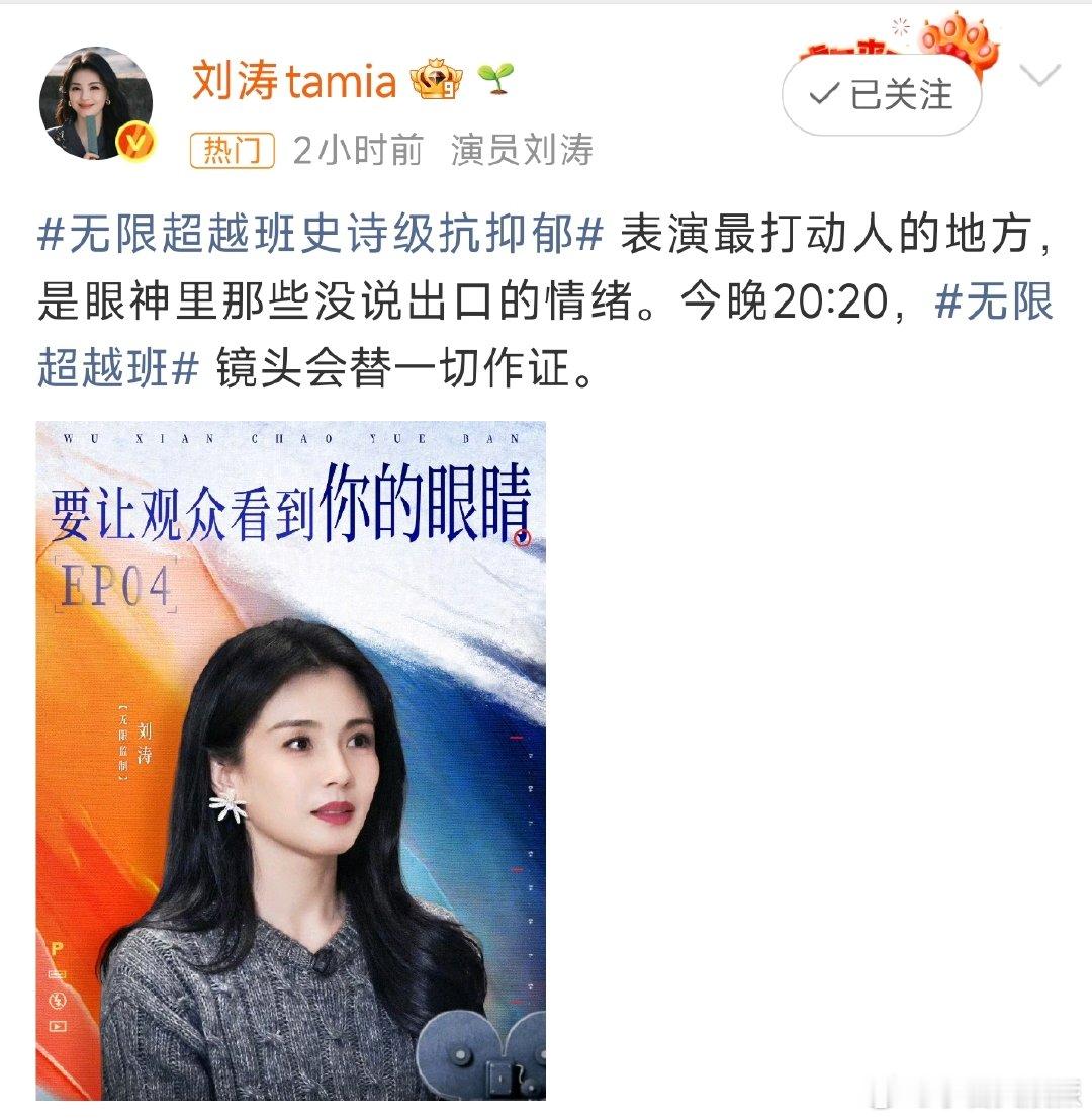 刘涛表演最打动人的地方刘涛眼神里那些没说出口的情绪 刘涛在《无限超越班》谈表演,说最打动人的是眼神里没说出口的情绪。今晚20:20,镜头会替一切作证,狠狠期待了!