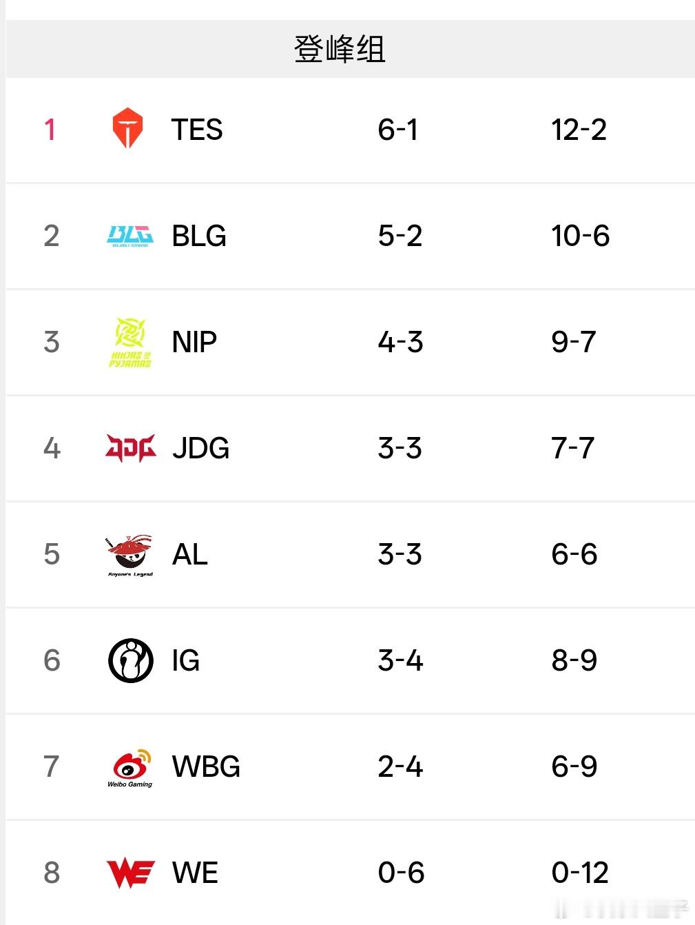 tes登峰组半程第一 TES前半程打了两场iG,所以在登峰组还没跟WBG交过手,下周三场的对手是WBG、AL。tes战胜nip2026lpl第二赛段TOP_ESPORTS