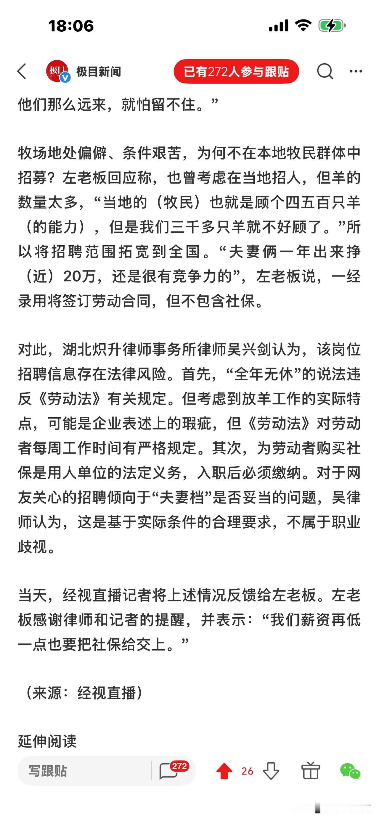 后来有律师说,工作全年无休、不买社保这两项已经触犯了《劳动法》。对于第一点全年无休,考虑到放羊的特殊工作,应该是老板表述上有瑕疵,不太可能一点都不休息。但不买社保肯定是违法的,所以老板后来又改口了,说可以交社保,但是需要在工资里扣除。