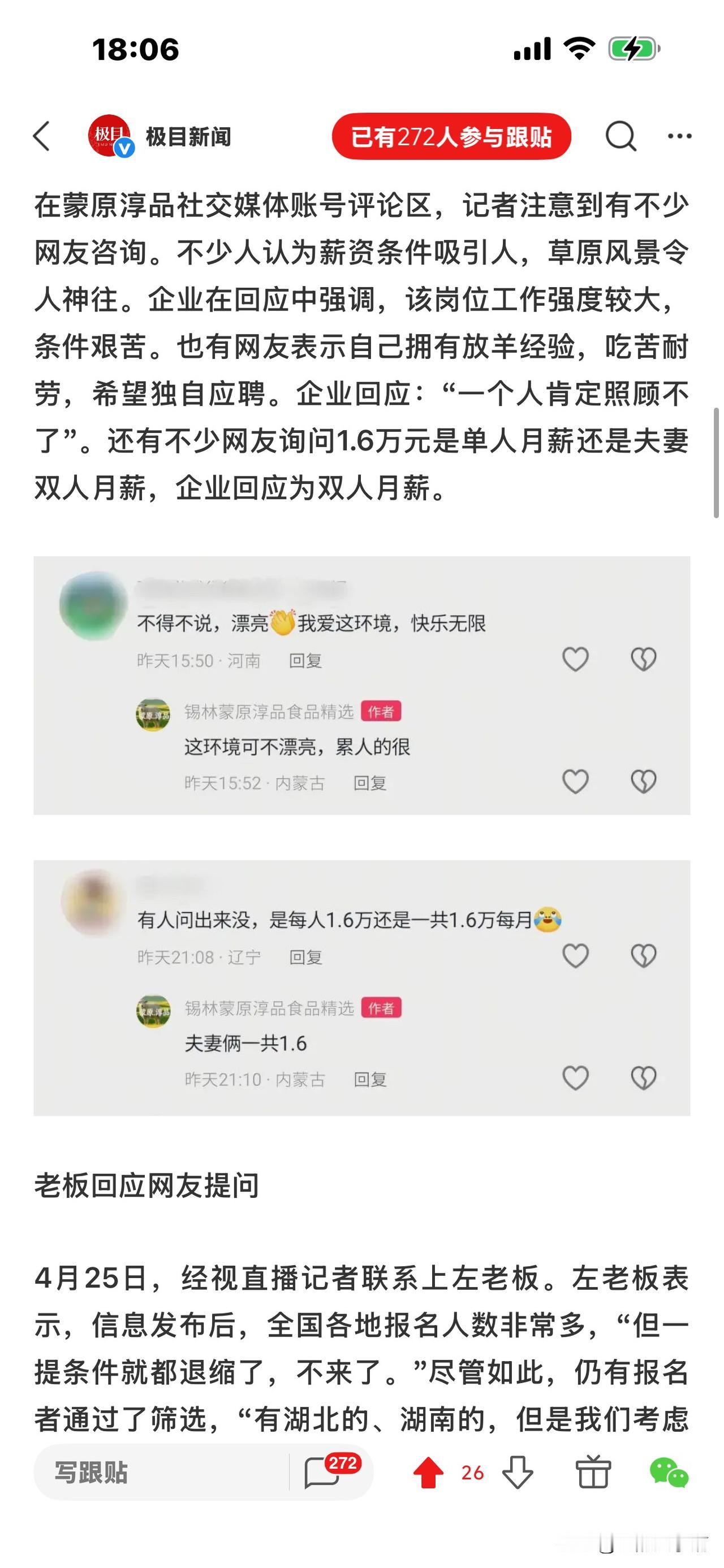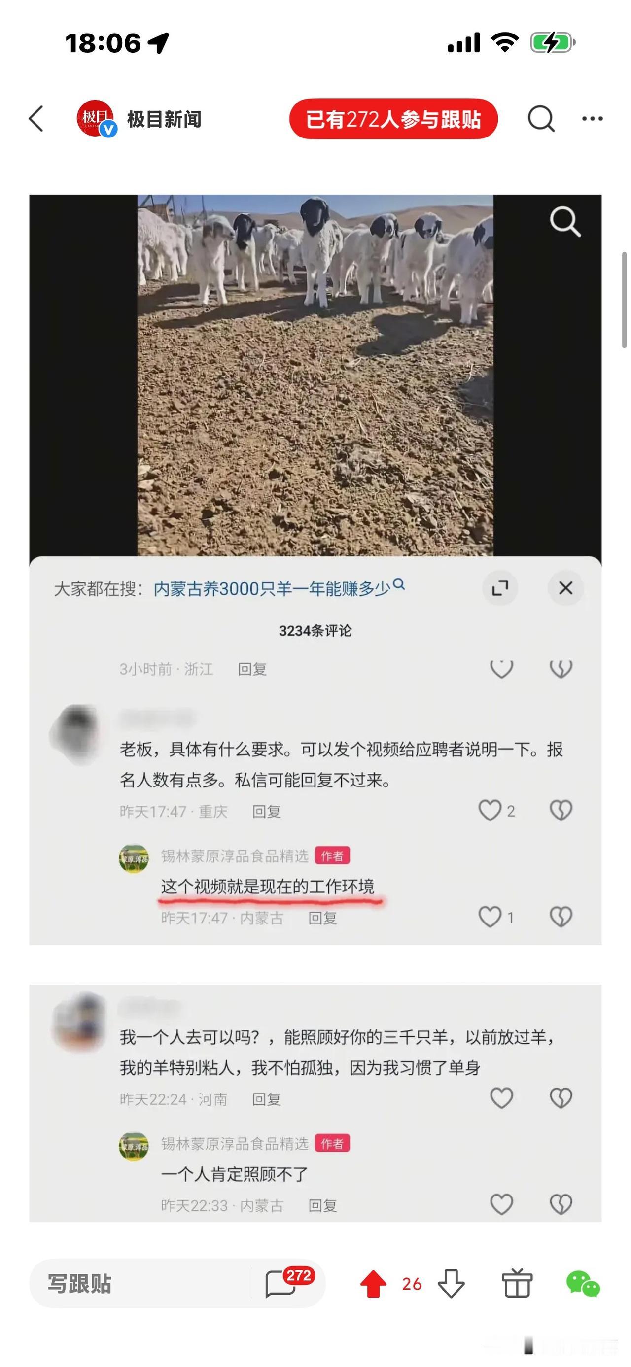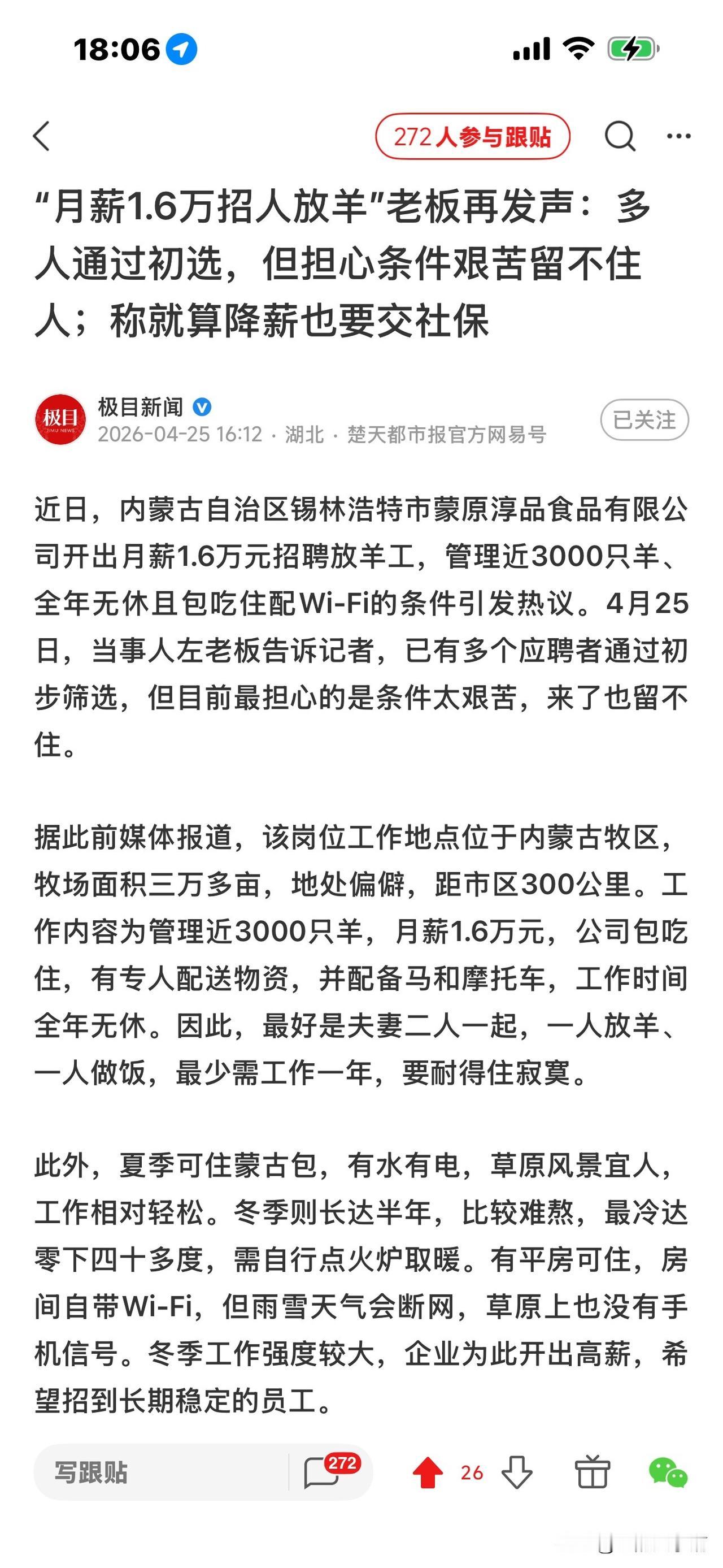 近日,“内蒙古自治区锡林浩特市蒙原淳品食品有限公司”招放羊工,上述薪资条件虽然优厚,但实际工作其实非常艰苦。