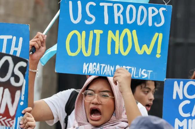 军演启动当天,数百名菲律宾民众在武装部队总部外集会抗议,挥舞着"停止军演""拆除在菲美军基地"等标语。