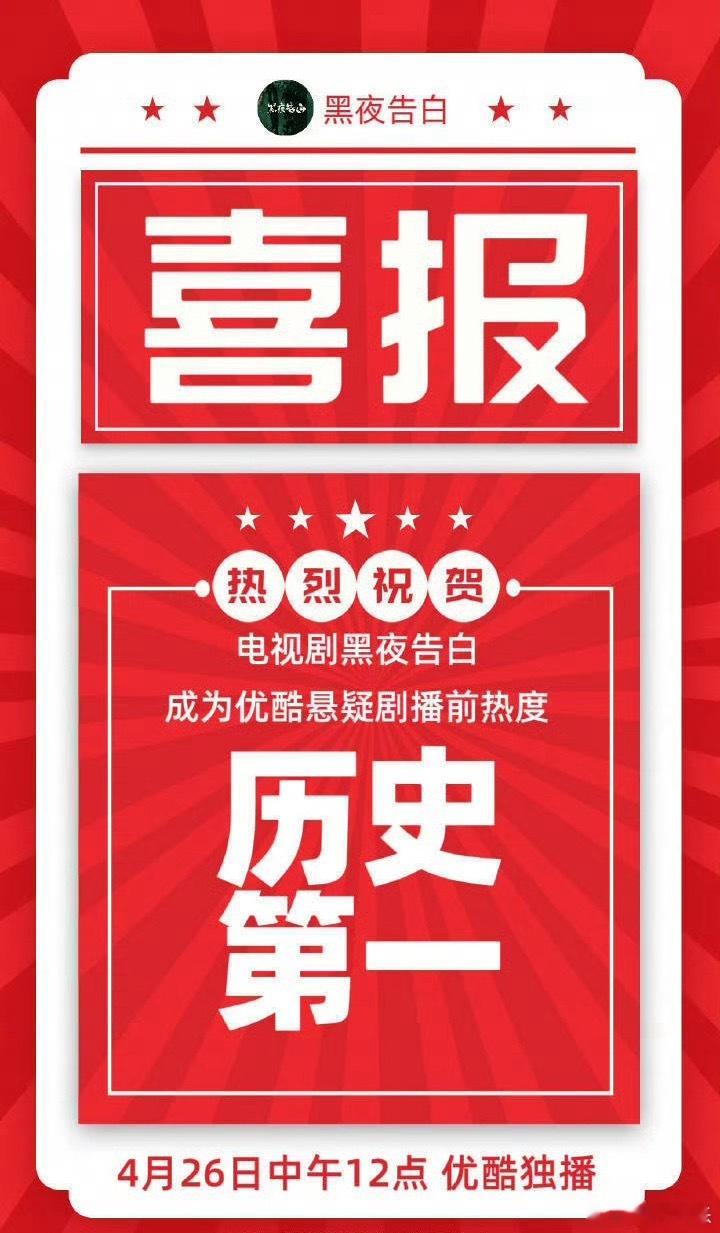 王鹤棣黑夜告白在开播前一天,破优酷悬疑剧开播热度历史最高记录,成为历史第一,王鹤
