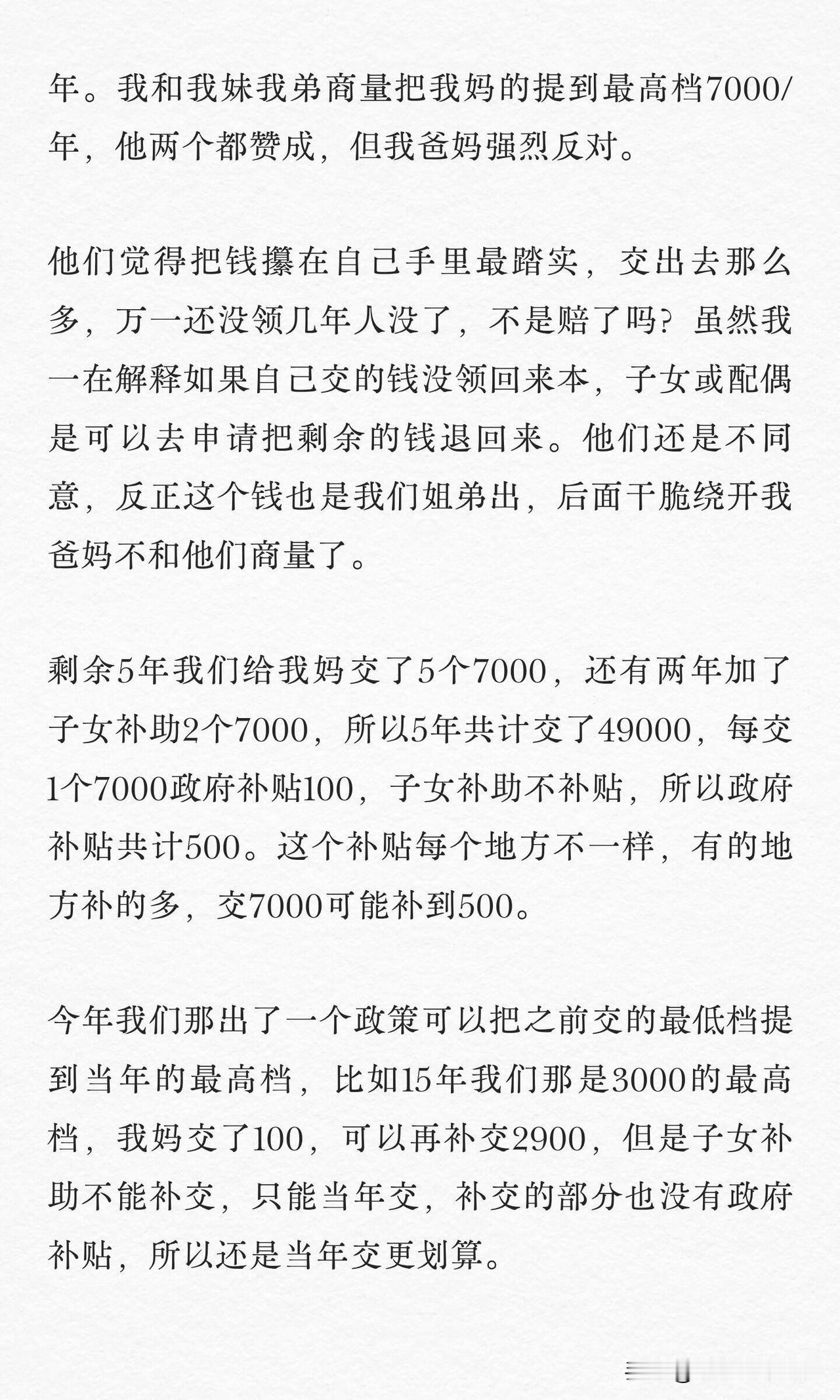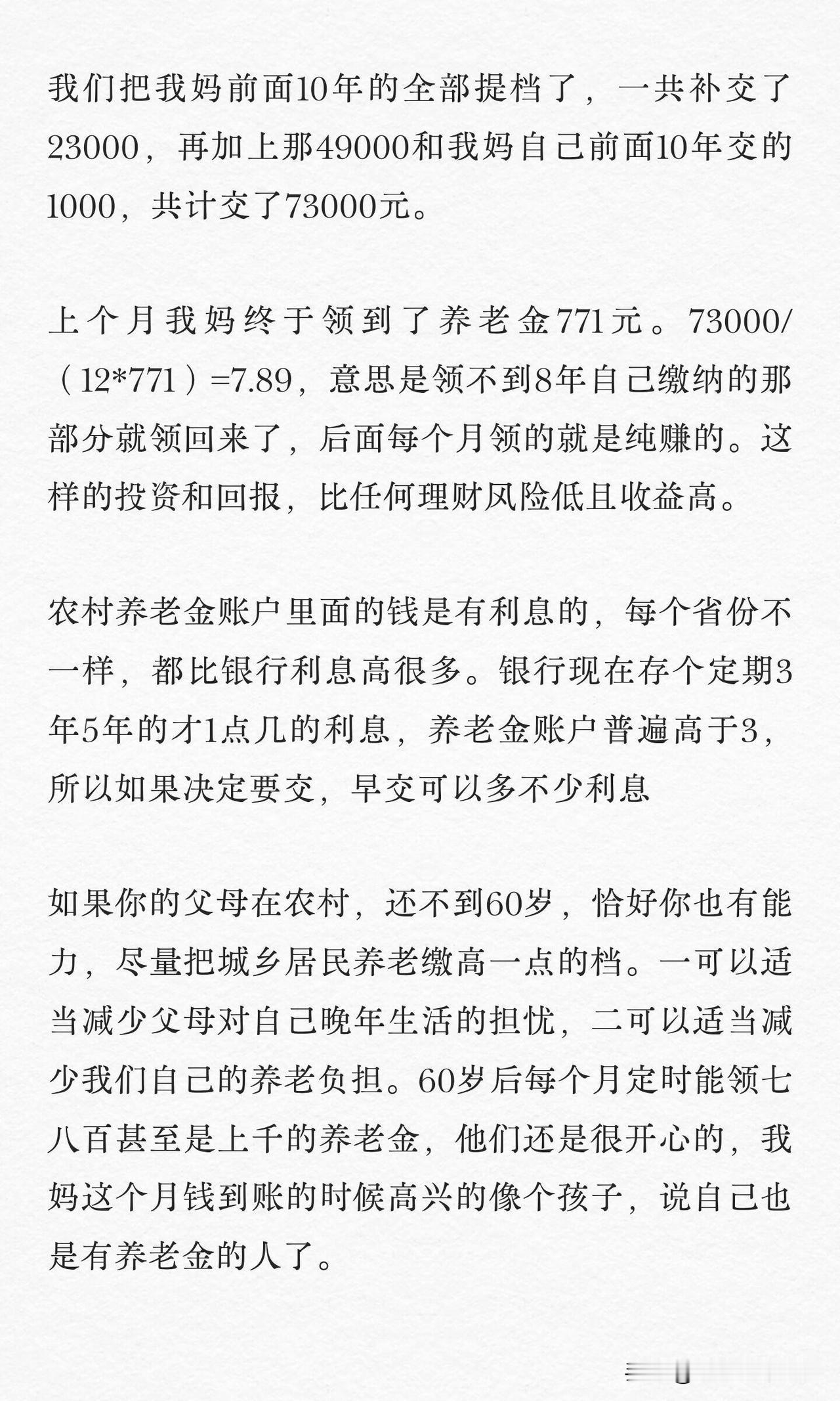 我爸早早就交了城乡居民养老的最低档,交够15年,一开始每月只能领160块,后来涨到220块,这点钱在农村也只是够买点油盐酱醋。我妈55岁时才交了10年最低档,还有5年就能交满,我和弟弟妹妹一合计,决定把她的档位提到最高档,可爸妈死活不同意,总觉得钱攥在自己手里才踏实,怕交了没领几年就亏了。我们干脆没再跟他们商量,悄悄给我妈按每年7000的最高档交了5年,还补了之前10年的差额,前后一共花了73000块。上个月我妈第一次领到了771块的养老金,她拿着手机反复看余额,跟我说“我也成了有退休金的人了”,那一刻我才觉得,所有的纠结都值了。