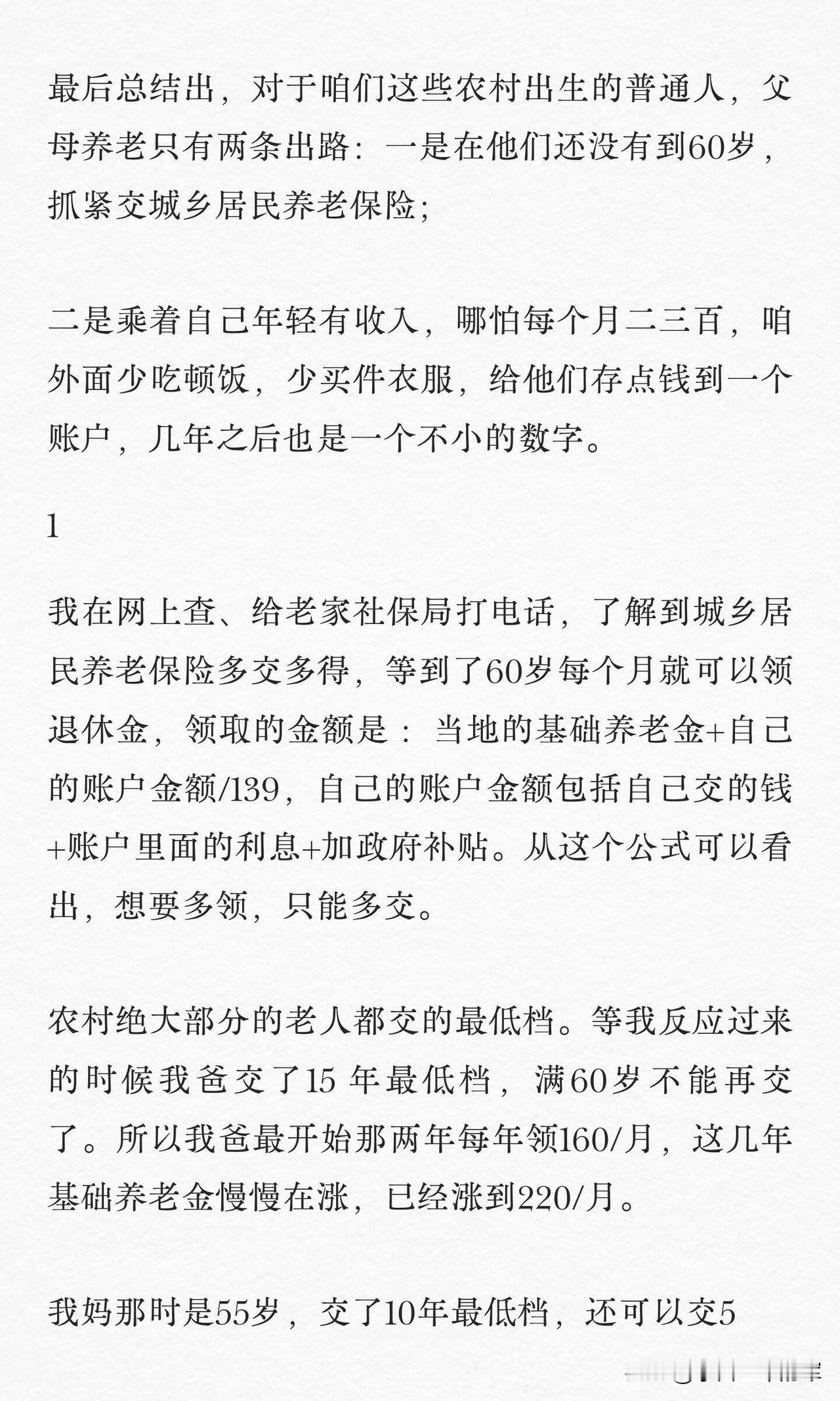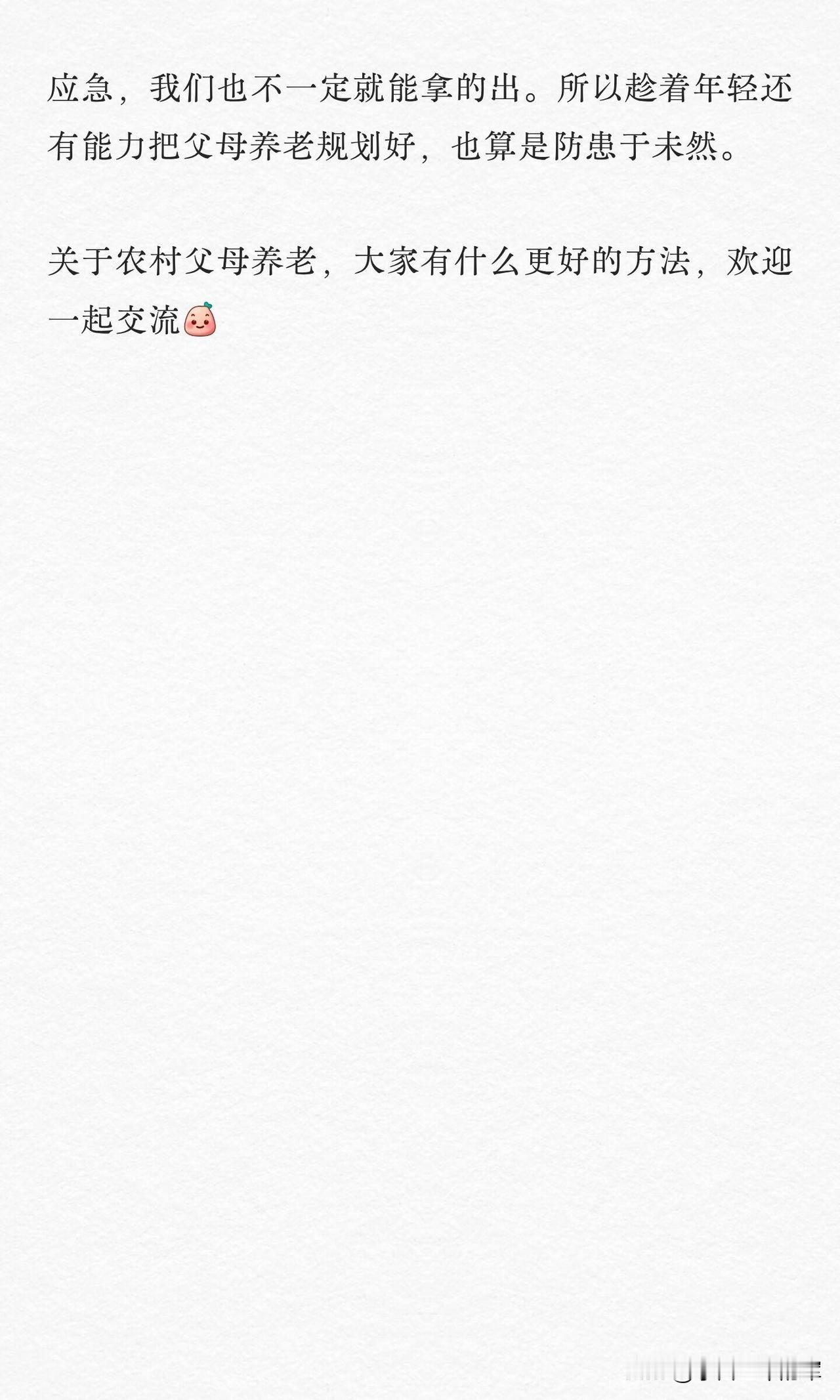 其实农村老人的养老,真的没那么复杂。优先给他们交上城乡居民养老,能提档就提档,这是国家给的最稳的兜底;再趁自己年轻有收入,每月挤点钱存起来,积少成多。早做规划,不仅能让爸妈晚年踏实,也能让我们自己不用在他们老了之后手忙脚乱。