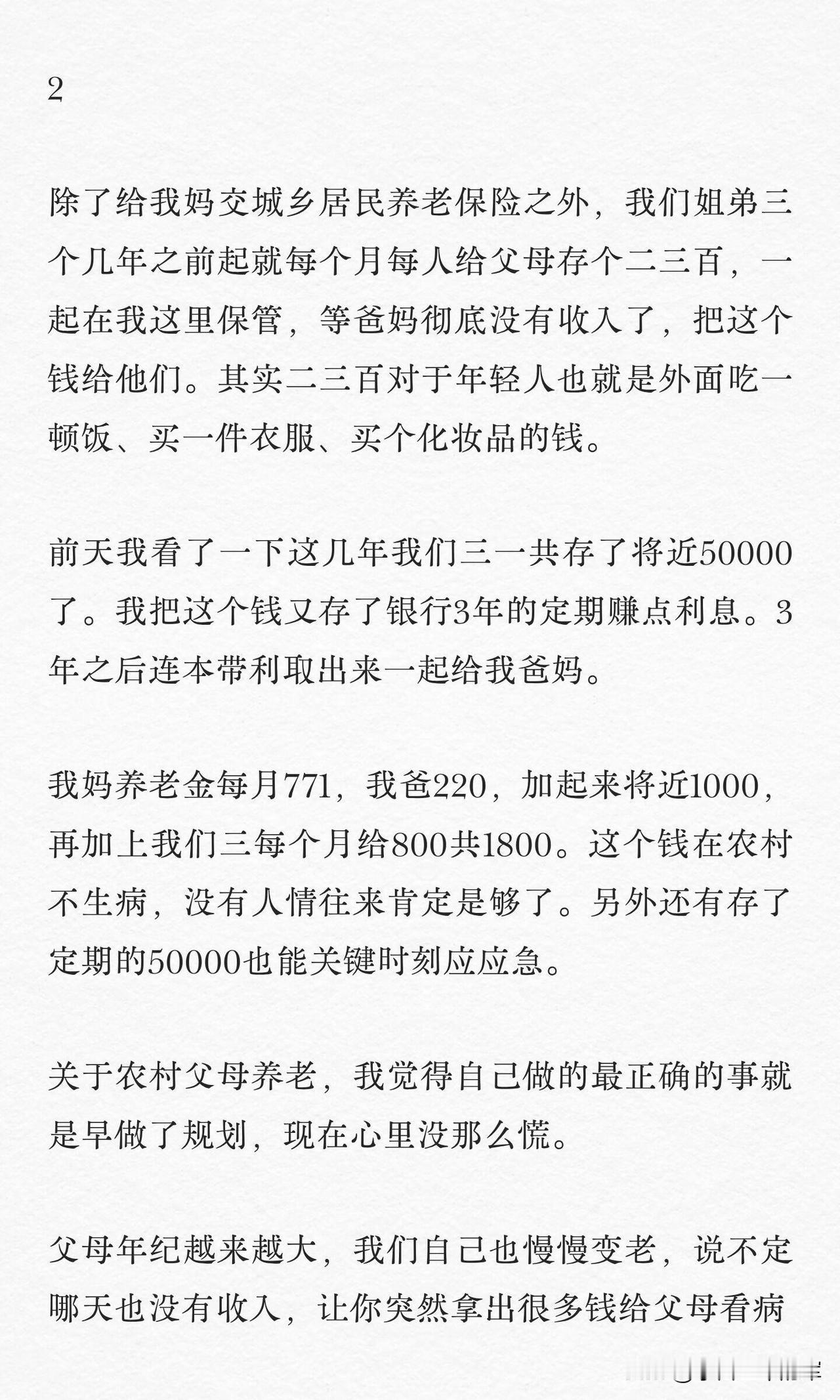 除了养老保险,我们姐弟三个还从几年前开始,每个月每人存两三百块到一个账户里,现在已经攒了快5万,我把这笔钱存了三年定期,留着给他们应急。我妈每月771,我爸220,加上我们每月给的钱,在农村不生病、没大开销的话,基本够用了,那笔定期存款也能在他们生病、需要人情往来时顶上去。