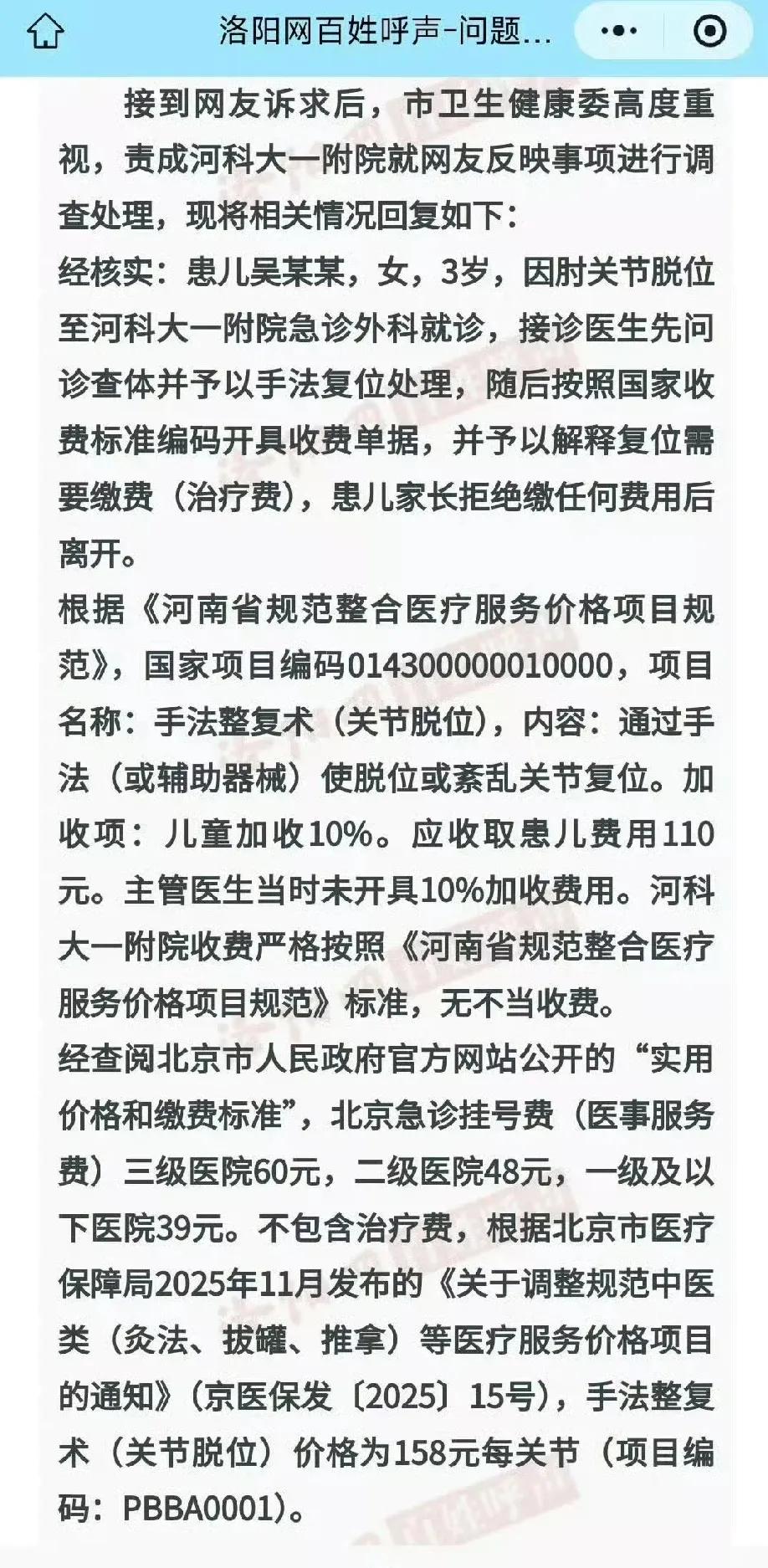 洛阳某三甲医院医生,给3岁孩子脱臼复位只花了1分钟,收费100元费用被家长举报。