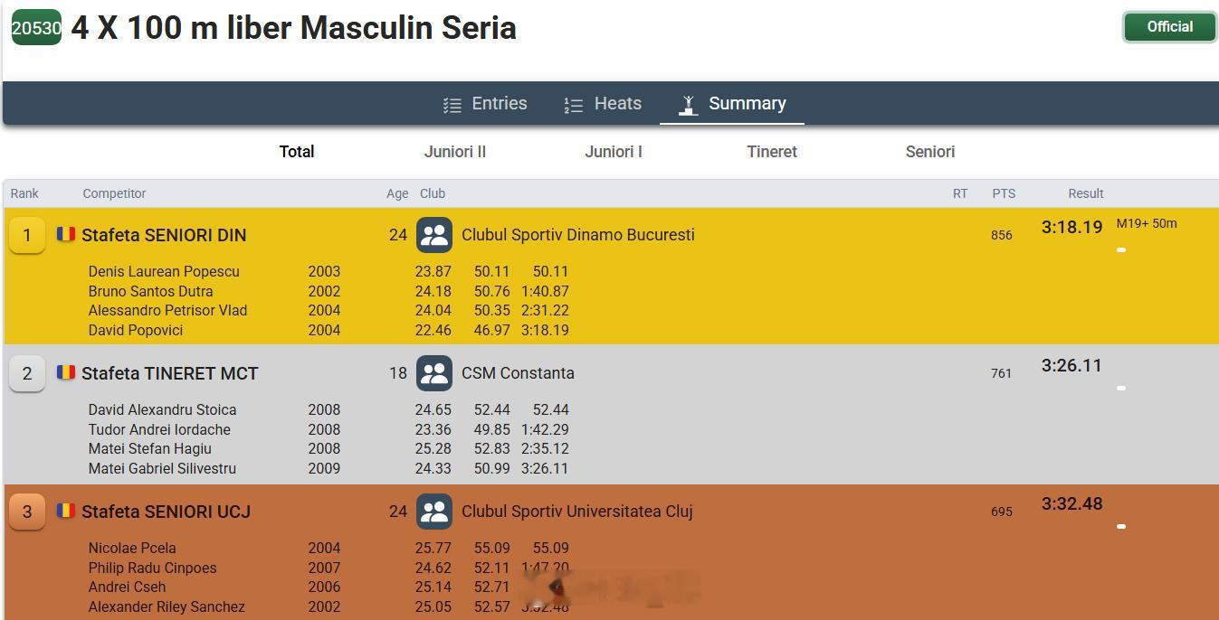 罗马尼亚游泳锦标赛 在前一天接力中波波分段游了46.97