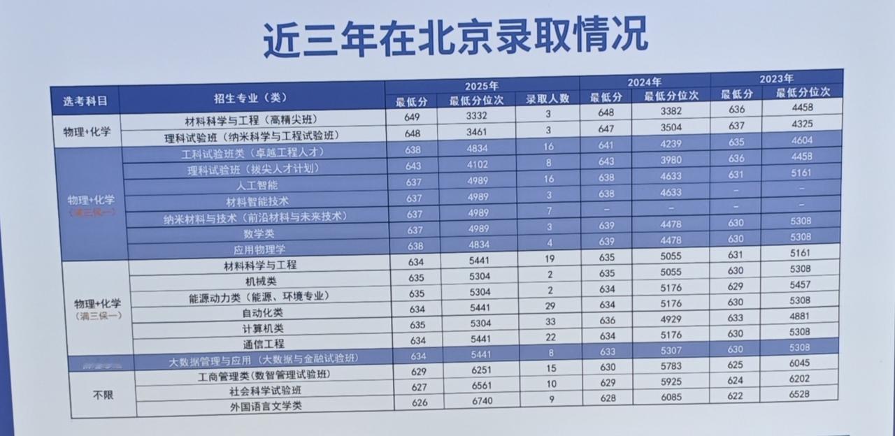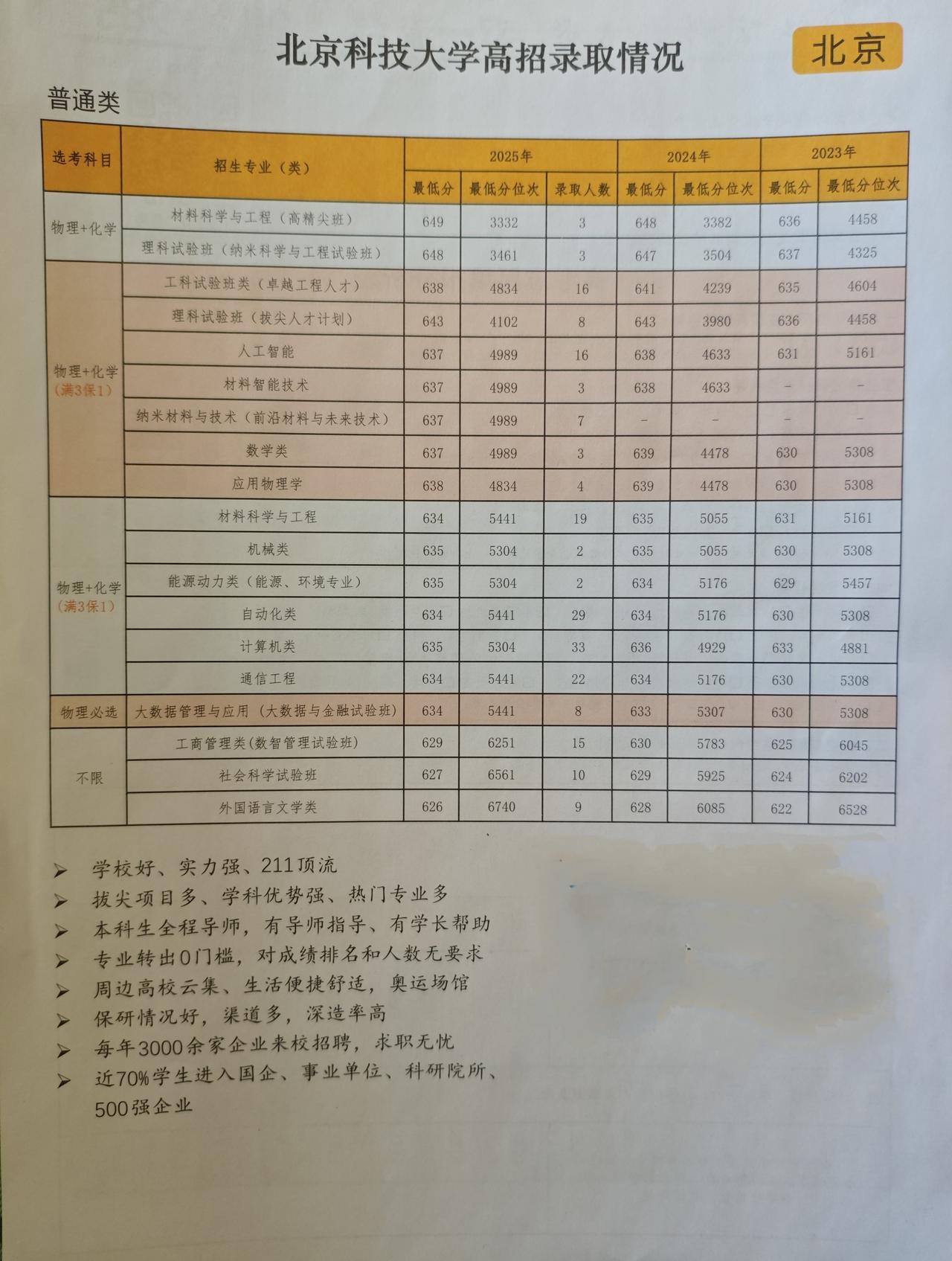 北科的高考录取分数不低,在北京能考上它的学生基本属于中上水平,生源质量挺扎实,去年物化类最低都要634分!材料类实验班的收分更高,最低649分,真不低了。