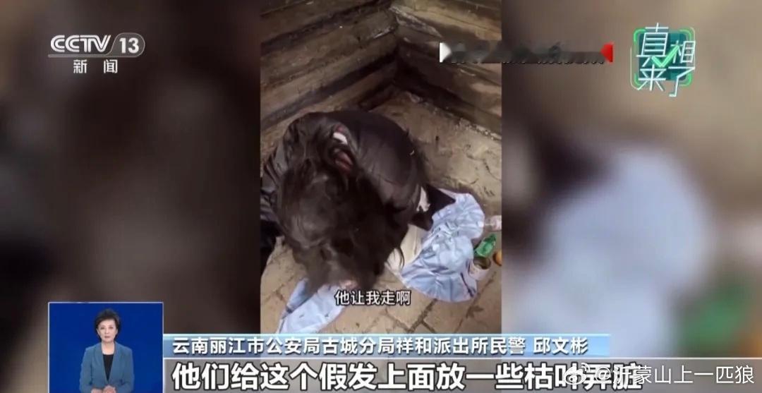 云南省丽江市公安局古城分局祥和派出所民警 邱文彬:演员杨某某去准备的时候,特意叮嘱她,不要自己化妆,不要往脸上擦粉。到了现场以后,他们给假发上面放一些枯叶弄脏,把假发弄得凌乱,再给她披上去,然后在她的手臂上弄一些受伤的痕迹,当然那个也是化妆化上去的。衣着方面也会强调,不要穿白鞋子、干净的鞋子,然后用床单裹住,穿着破棉袄,让她瑟瑟发抖,整个过程都是按照刘某他们设计好的剧本来演的。