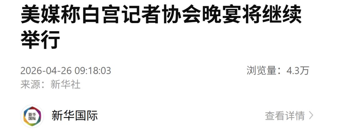 美国白宫记者晚宴大厅发生枪击事件,特朗普“安全无恙”,白宫记者协会晚宴将继续举行