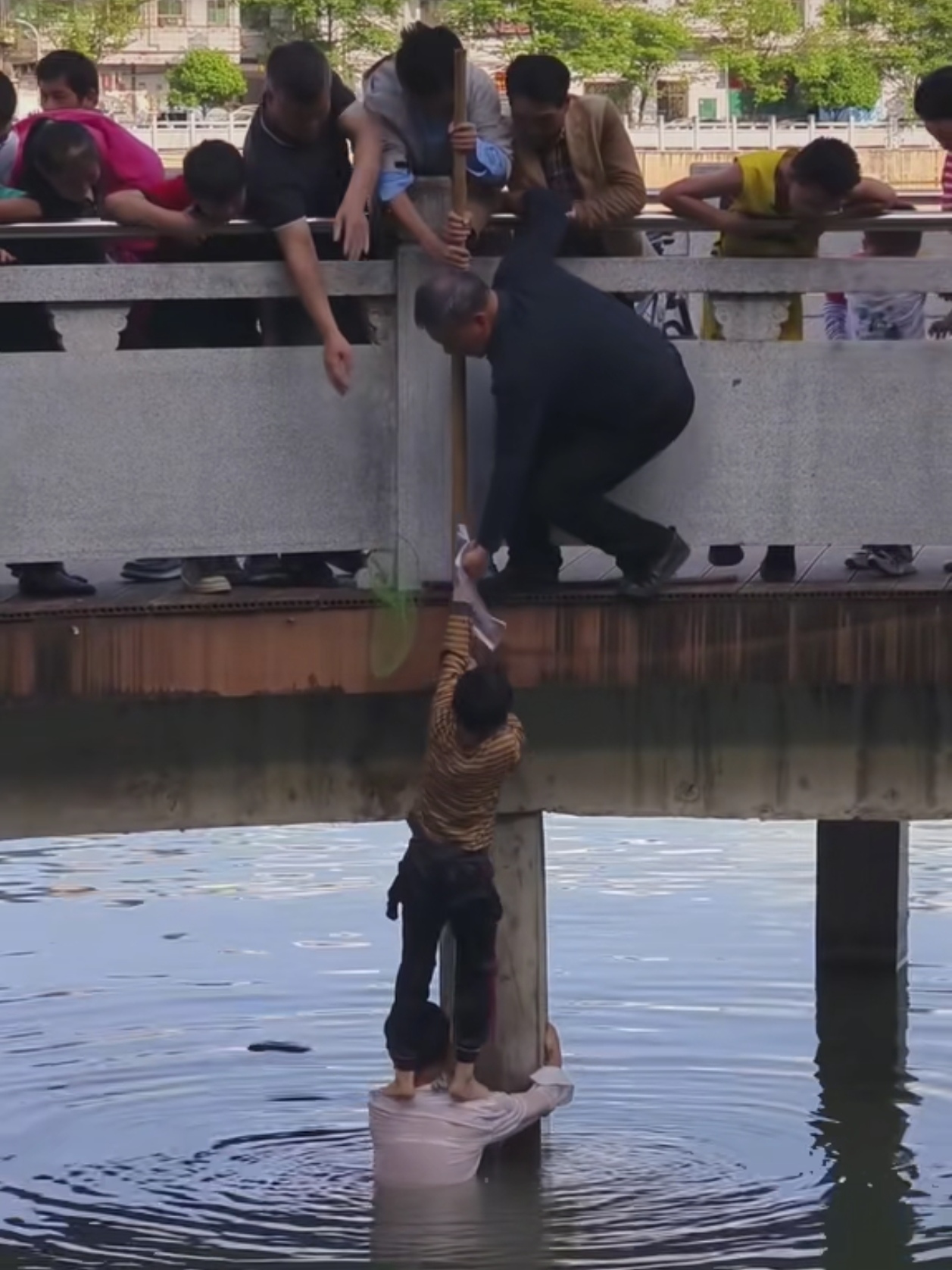△孩子踩在资小明肩膀上,被岸上群众拉起。