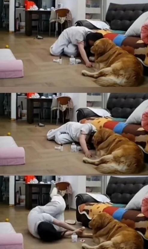 一旁的狗狗倒是乖,全程趴在地上一动不动,偶尔抬头看看主人,那眼神懵懵懂懂的,好像在疑惑“主人,你怎么老倒啊?我不疼,你别着急”。