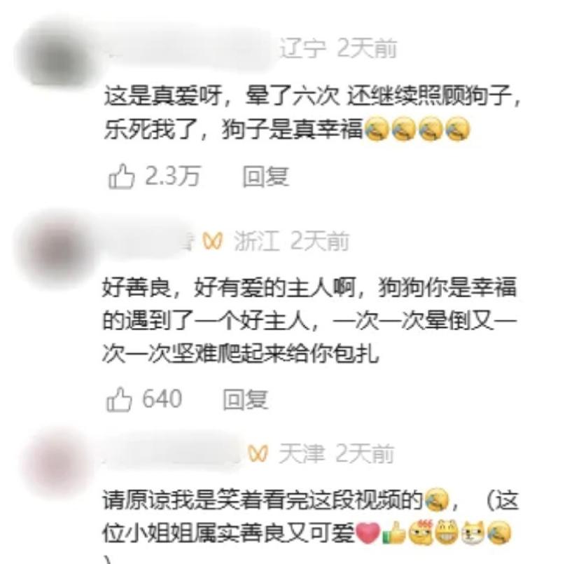 很多人看了视频,都觉得又好笑又心疼,有人说“这大概就是双向奔赴的爱吧,狗狗乖乖配合,主人拼尽全力”,也有人疑惑,晕血真的能晕成这样吗?