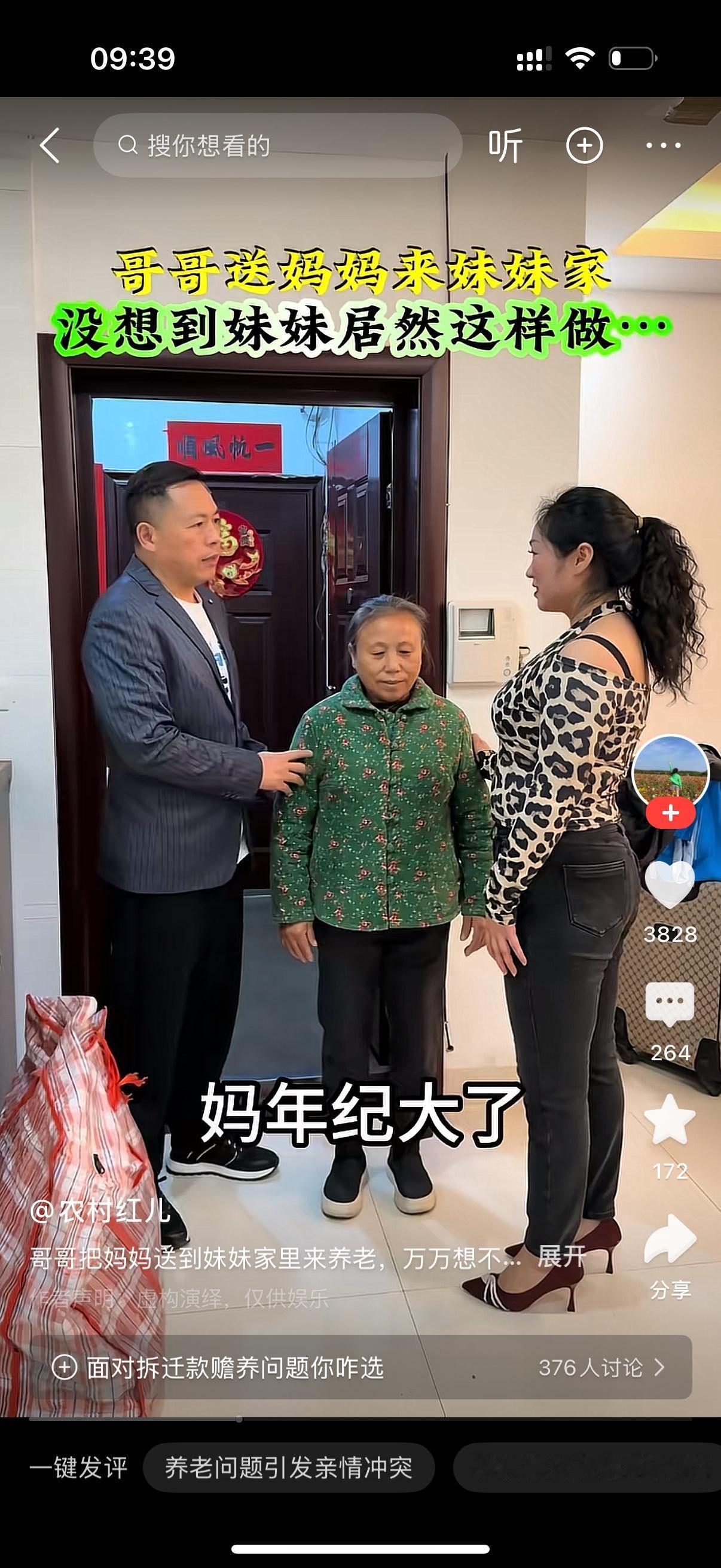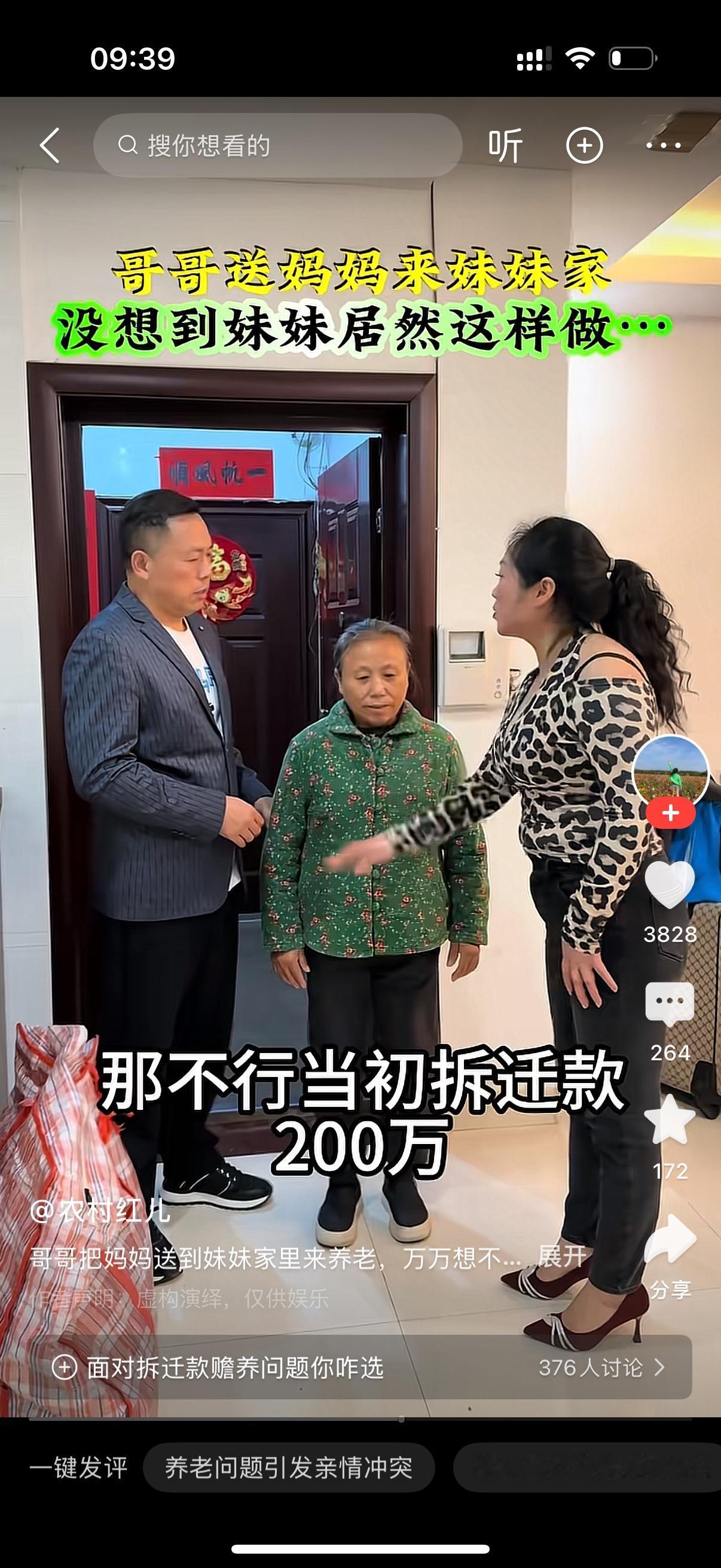 哥哥送妈妈到妹妹家里来住。妹妹打开门,说你们来了啊。哥哥说,妈妈在我家住了一年了,现在送你家,你养她一年。妹妹说,不行。当初拆迁款200万,妈可是全部给了你。你得负责到底的。哥哥发飙,你也是妈亲生的女儿,赡养父母是你的责任和义务。你咋好意思说这话?妹妹也怒吼,这不可能的,谁拿钱谁照顾,你们走吧。说着,妹妹直接把哥哥和母亲推了出去。母亲心里那个痛啊。