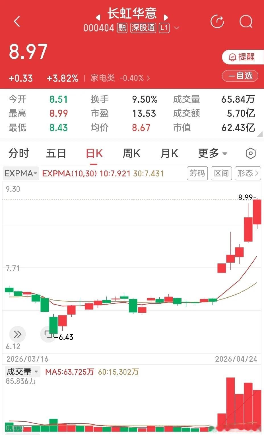 还有长虹华意,越等回调越不回调,一路震荡上行。8.99关键价位一出,心里越发犹豫不敢进场。