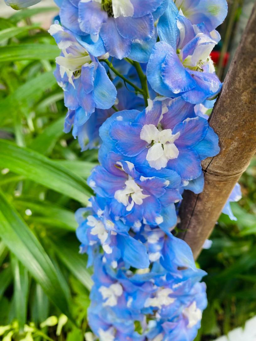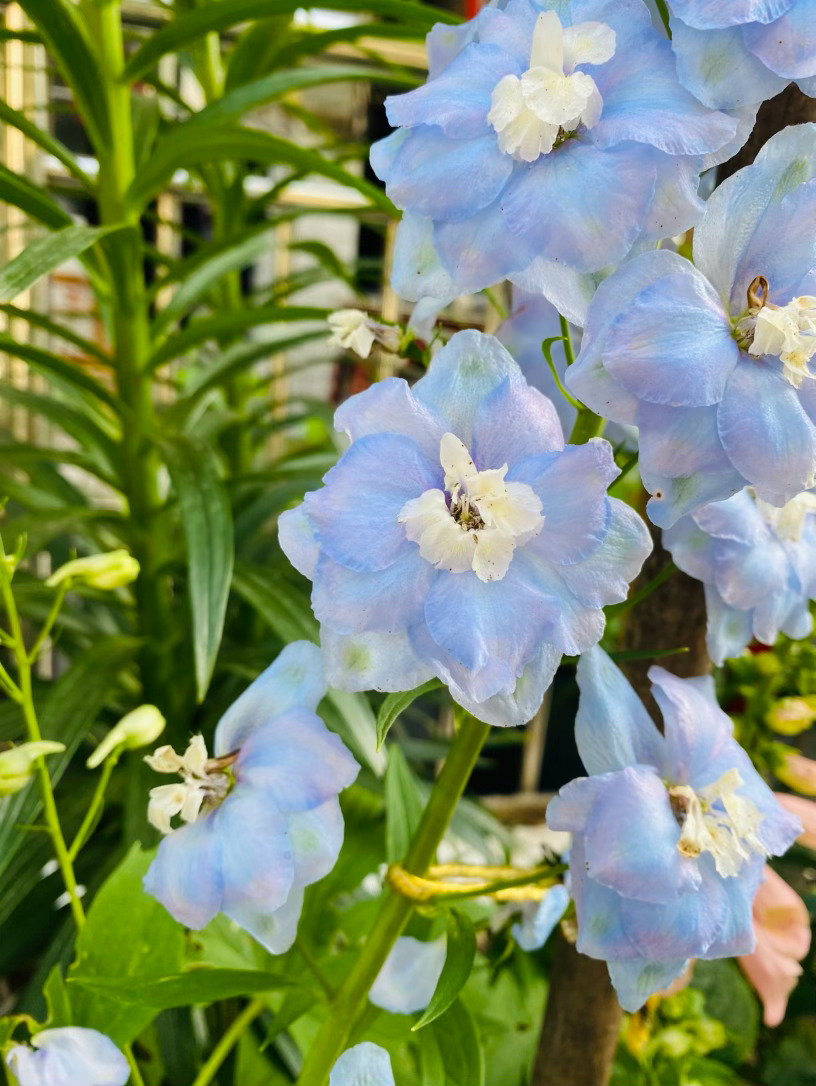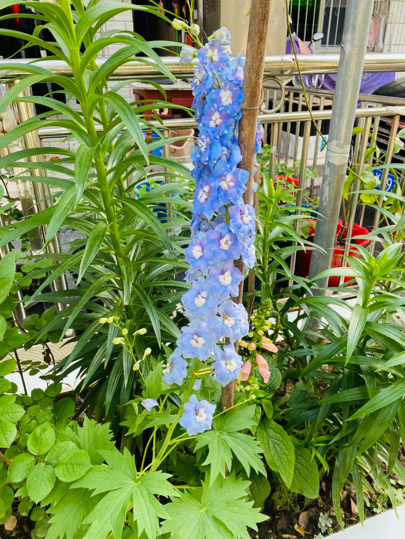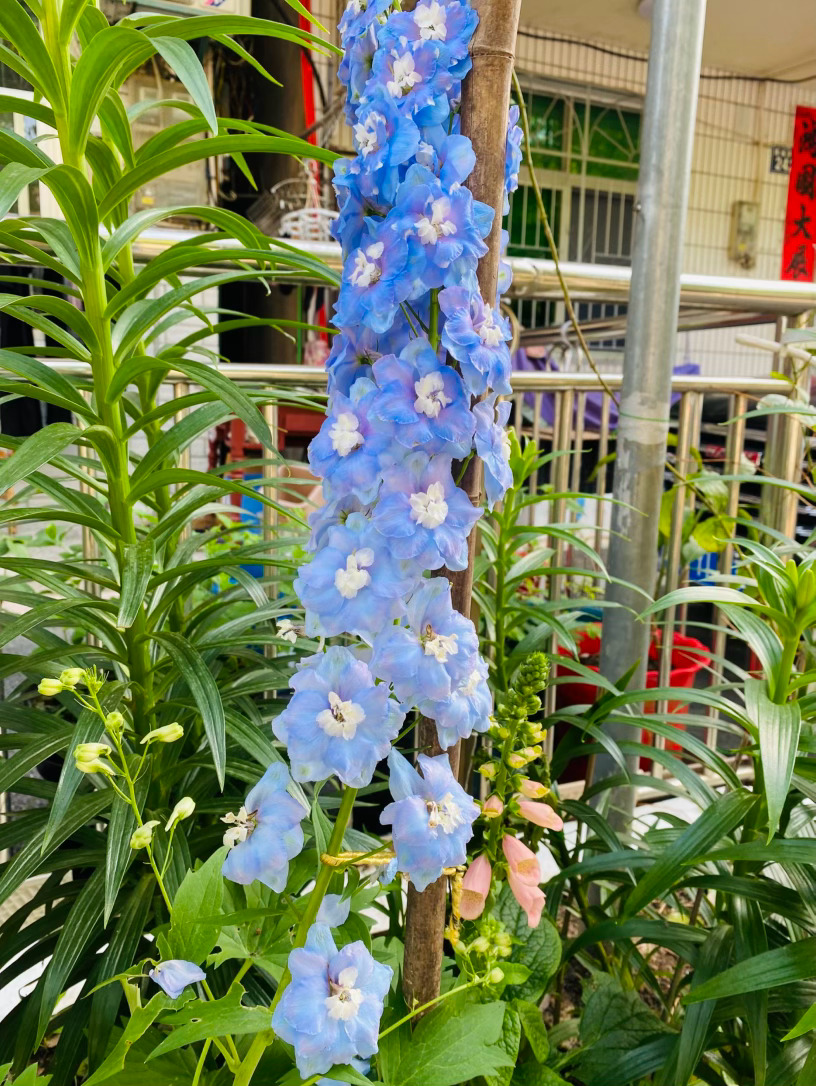 它生得挺拔而骄傲,修长的花穗直指苍穹,宛如一座座微缩的浪漫宝塔。细看那独特的花距,宛若灵动的燕尾,在风中蹁跹,仿佛下一秒便要结伴飞向蔚蓝的天际。为了托起这份沉甸甸的美,细竹竿默默化作它的脊梁,让它得以在庭园中傲然挺立,勾勒出最迷人的竖向风景。