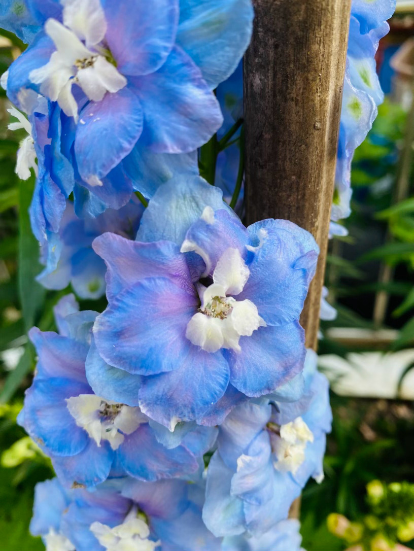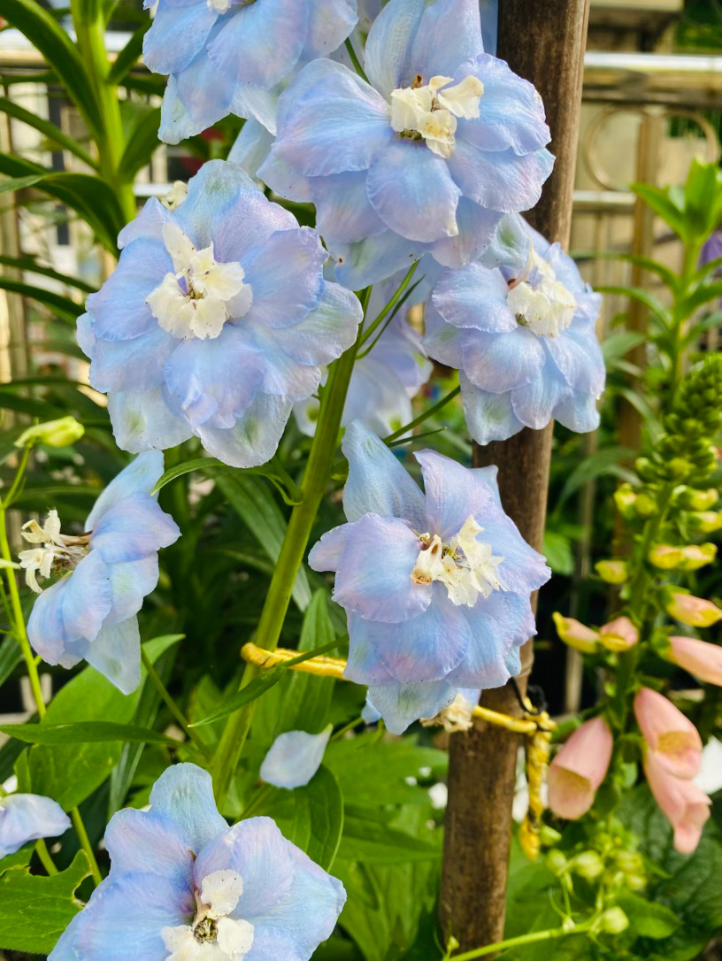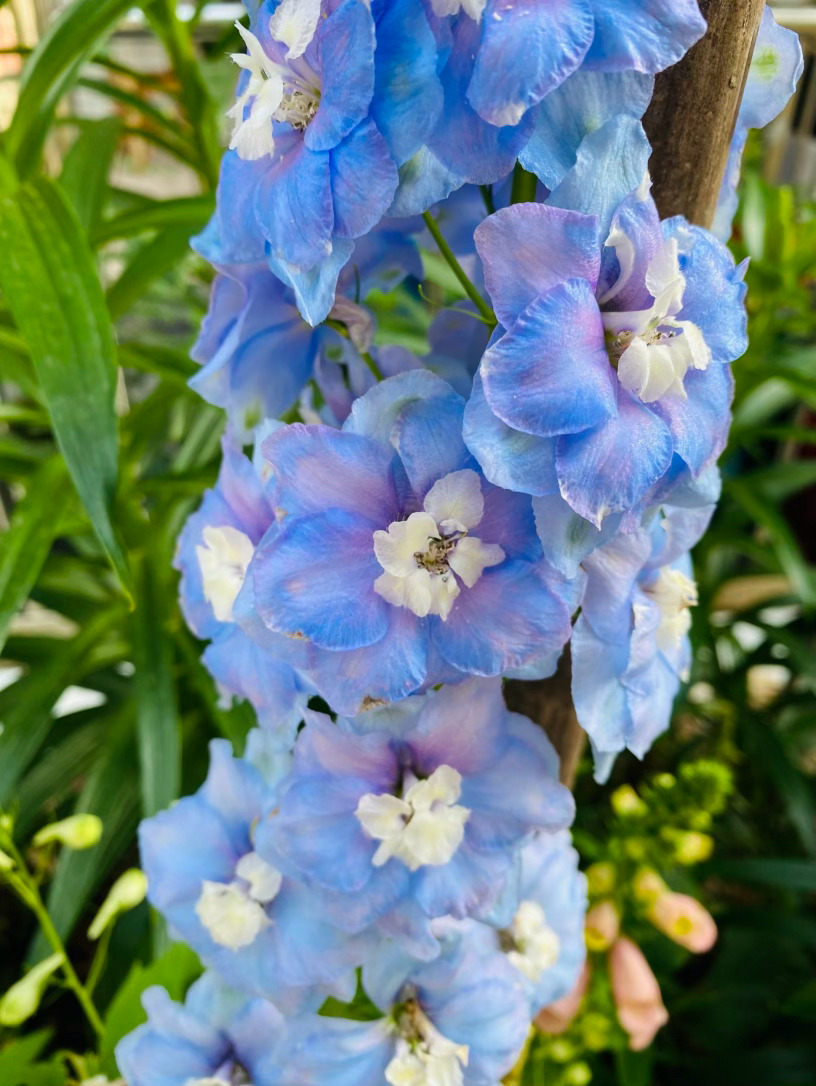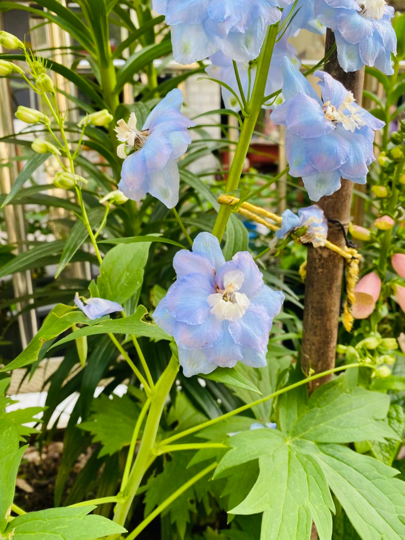它生得挺拔而骄傲,修长的花穗直指苍穹,宛如一座座微缩的浪漫宝塔。细看那独特的花距,宛若灵动的燕尾,在风中蹁跹,仿佛下一秒便要结伴飞向蔚蓝的天际。为了托起这份沉甸甸的美,细竹竿默默化作它的脊梁,让它得以在庭园中傲然挺立,勾勒出最迷人的竖向风景。