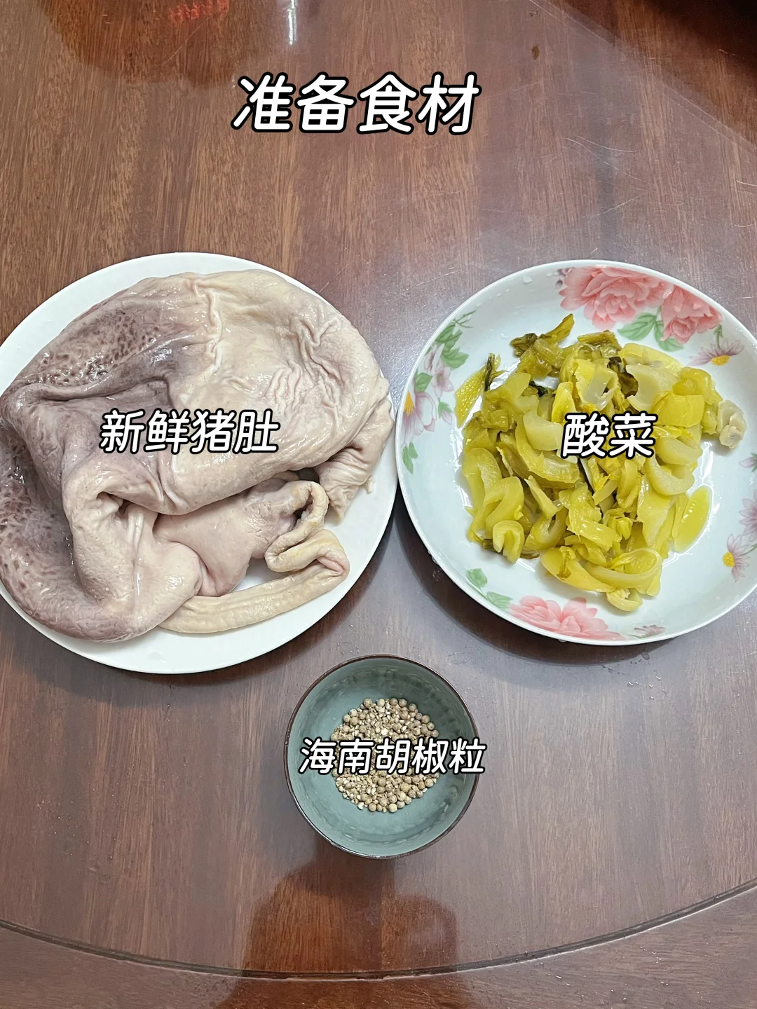 新鲜猪肚1个、潮汕酸菜1小颗、海南胡椒粒15g、小芹菜1小把、清水适量。