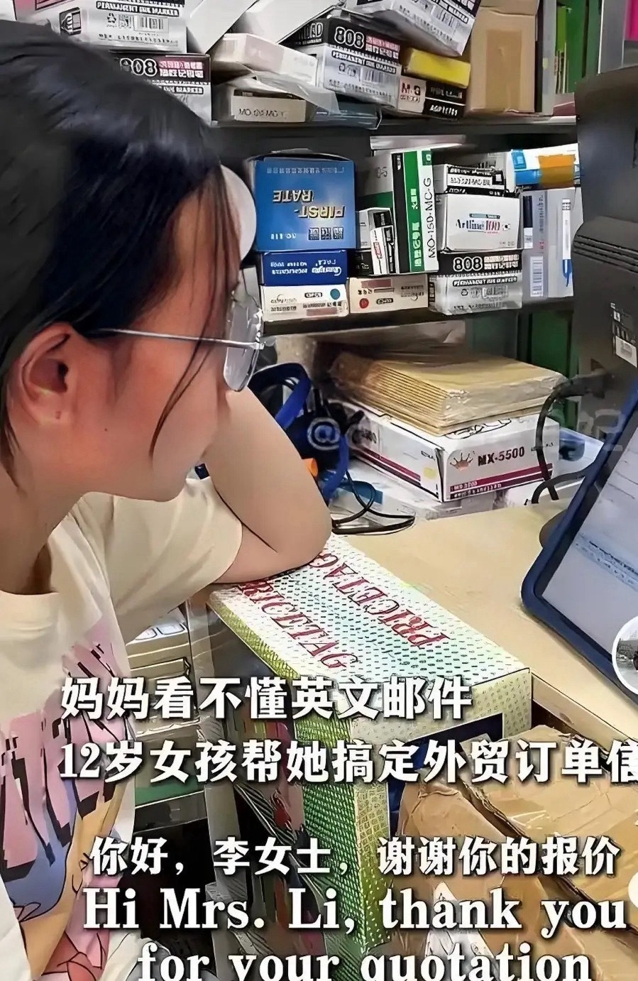2024年8月的一天,店里来了一位外籍客商,拿着样品详细询价。夫妻俩看着客户,手足无措不知道怎么回应,就在这时,当时还在上小学六年级的李若熙主动站了出来。